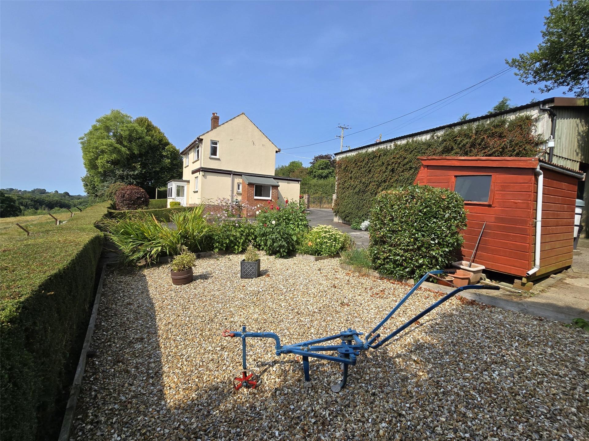 These are found on all sides with shrub planting at the front and behind the stone wall along het lane edge. A lawn runs around the side and back of the house behind low hedging so as not to interrupt the views. A gravel area and stocked bed sits off to one side of the drive and from here you get a wonderful distant view behind the house running off down the valley. Beyond the formal garden and behind hedging there is an area of agricultural land with a 5 bar gate leading out on the junction with the lane and the road. This is currently used by a local farmer in conjunction with the rest of the field which is owned by the farm down the lane.