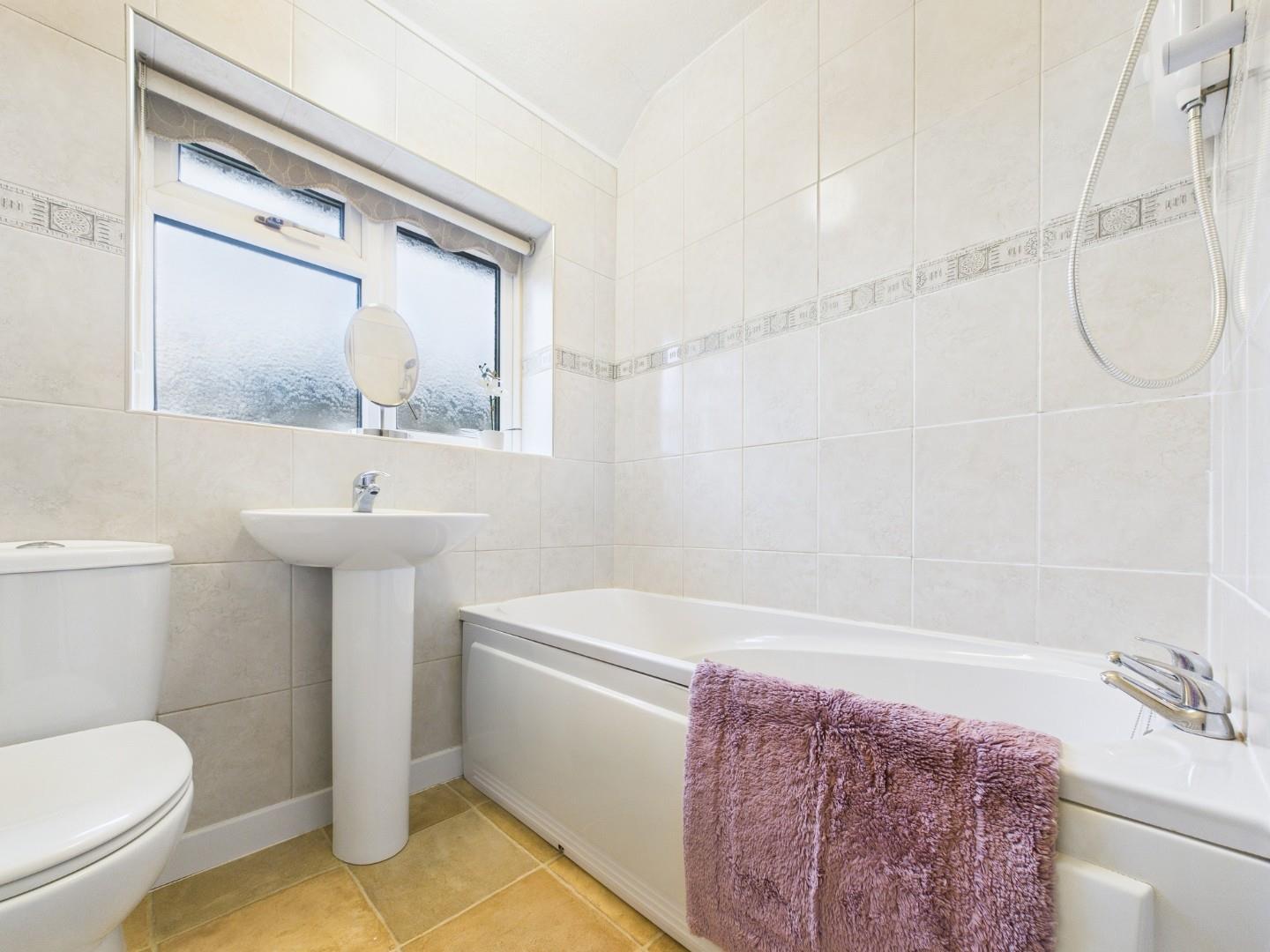 Family Bathroom - 2.33 x 1.85 (7'7" x 6'0") - This bathroom is fully tiled and fitted with a three piece suite comprising a panelled bath with electric shower over, dual flush WC and pedestal wash basin with mixer tap over. The room is lit by a ceiling mounted light fitting an also benefits from obscured glazed windows to the rear aspect, allowing for excellent natural light while ensuring privacy. The gas combi boiler is located here.
