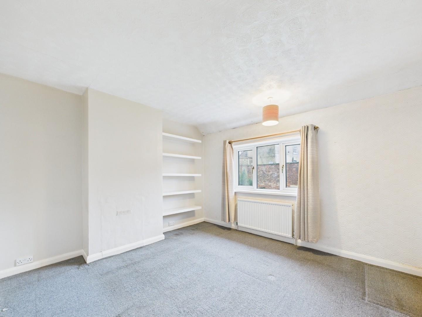 Bedroom One - 3.73 x 3.58 (12'2" x 11'8") - This generously sized double bedroom features fitted shelving to one side of the chimney breast, providing practical storage. A rear-facing window offers a lovely view over the garden.