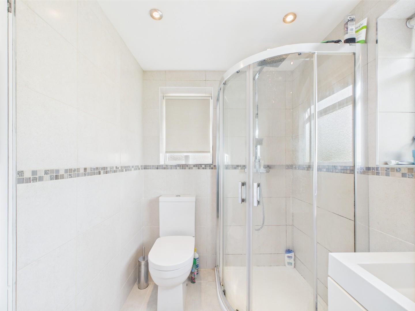 Bathroom - 2.92m x 1.73m (9'6" x 5'8") - A fully tiled room with dual aspect double glazed, obscured glass windows and spotlights to the ceiling. Fitted with a four piece suite consisting of corner shower cubicle with sliding glass doors, mains waterfall shower and separate handheld shower head, panelled bathtub, vanity style wash hand basin with two drawers and a dual flush WC. There's also a chrome ladder style towel rail.