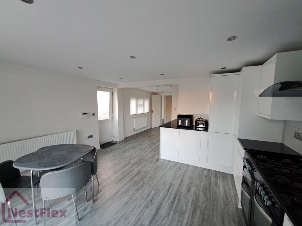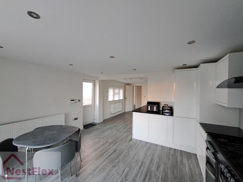 Range of white, base and wall mounted units. UPVC door to side. UPVC patio doors to rear. Laminate flooring. Sink unit with mixer taps. Integral dishwasher, fridge/freezer and washer/drier . Space for range style cooker. Extractor hood.