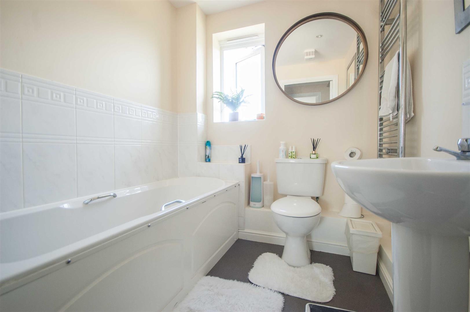 Bathroom: - 1.93m x 1.85m (6'4" x 6'1") - Obscure double glazed window to rear, panel bath, low level W/C, pedestal hand wash basin, chrome towel radiator, part tiled walls.