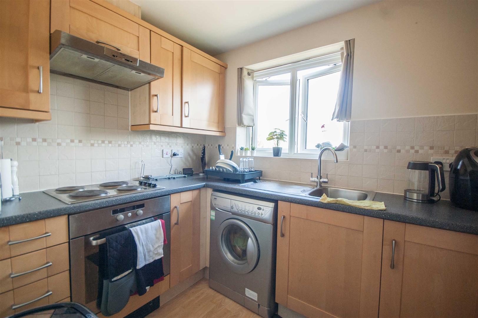 Kitchen: - 2.97m x 1.91m (9'9" x 6'3") - Double glazed window to rear, range of wall and base units, rolled edge work surfaces with stainless steel sink inset, integrated low level oven, electric hob, with extractor over, space for fridge freezer, washing machine, part tiled walls.