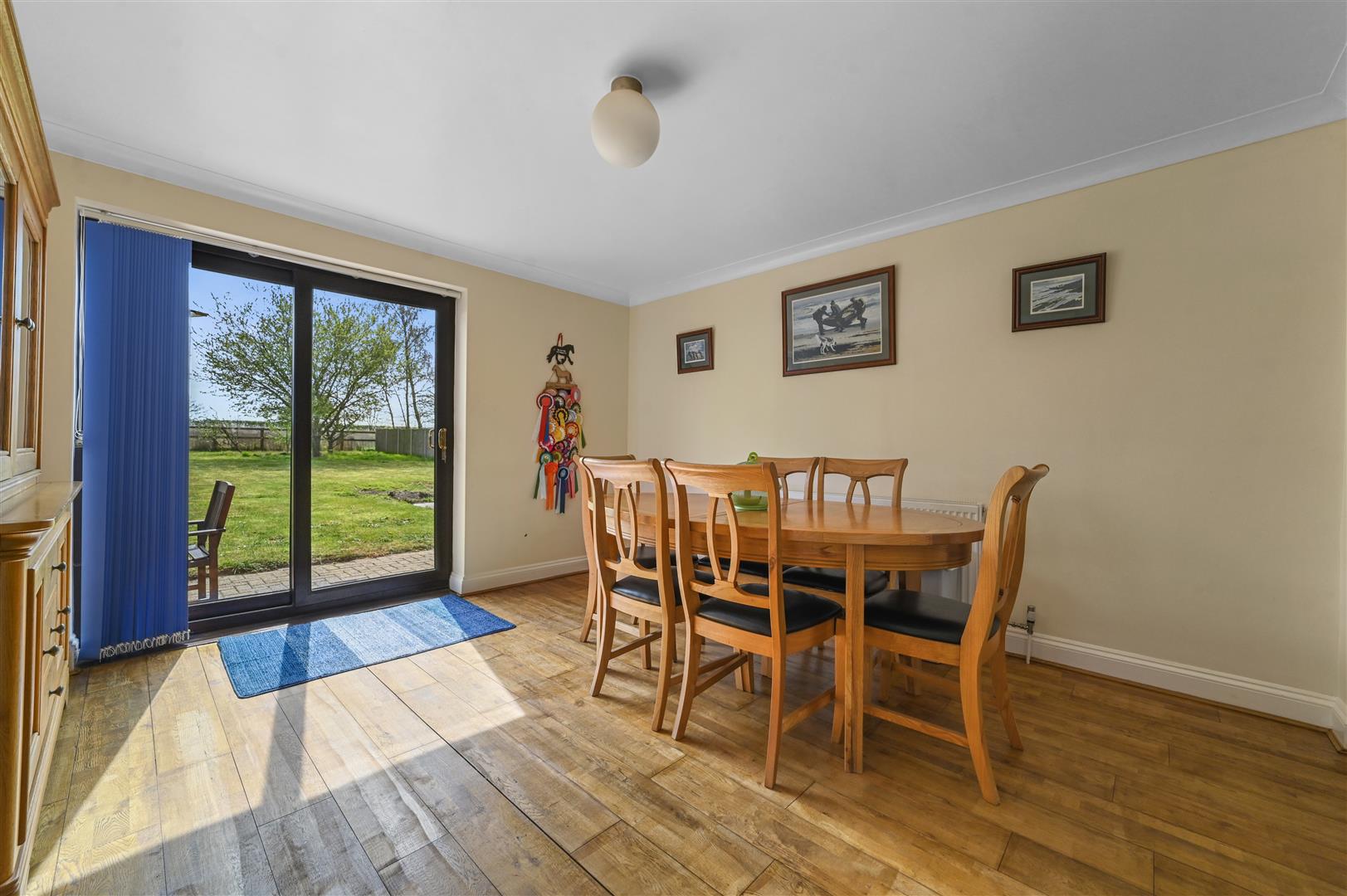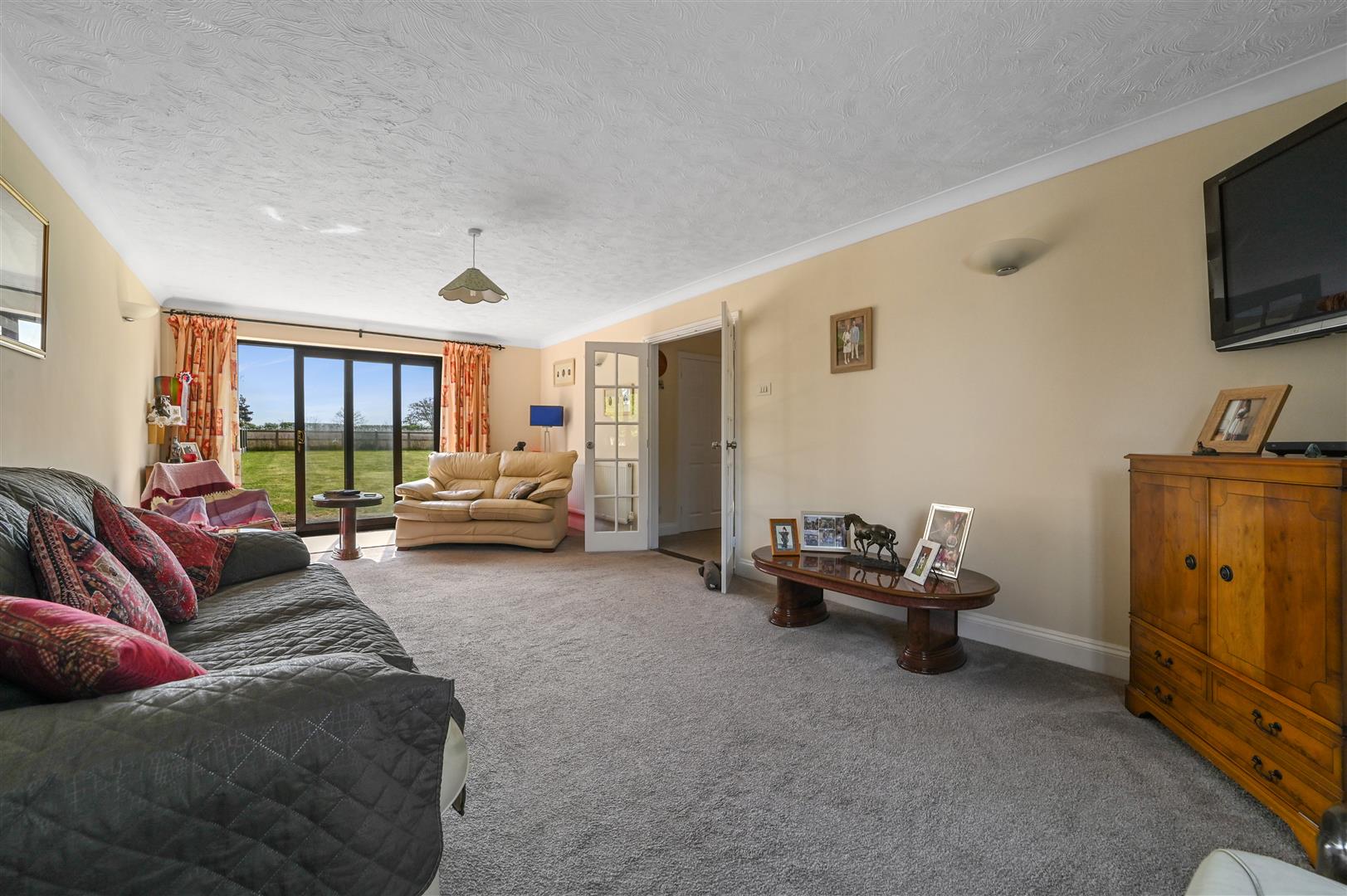 Step inside to a spacious entrance hallway, setting the tone for the well-proportioned living spaces throughout. The large dual-aspect living room is flooded with natural light and features sliding doors opening onto the expansive rear garden-ideal for entertaining or simply relaxing with family while soaking in the countryside outlook.