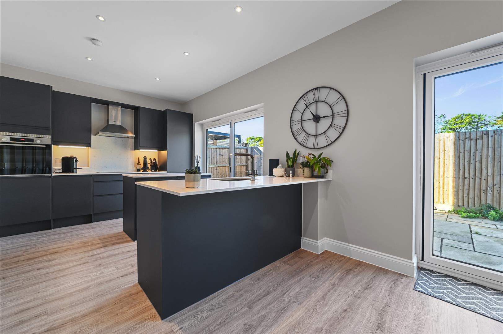 The welcoming entrance hall sets the tone for the property, leading into a bright and spacious open-plan kitchen and dining area. Designed with both style and practicality in mind, the kitchen features a central island with Silestone worktops, sleek fitted units, a breakfast bar, and high-quality integrated appliances. Twin sets of bi-fold doors flood the space with natural light and provide direct access to the garden. A useful utility room, separate study, cloakroom, and a generous sitting room with glazed doors complete the ground floor, which benefits from the luxury of underfloor heating.