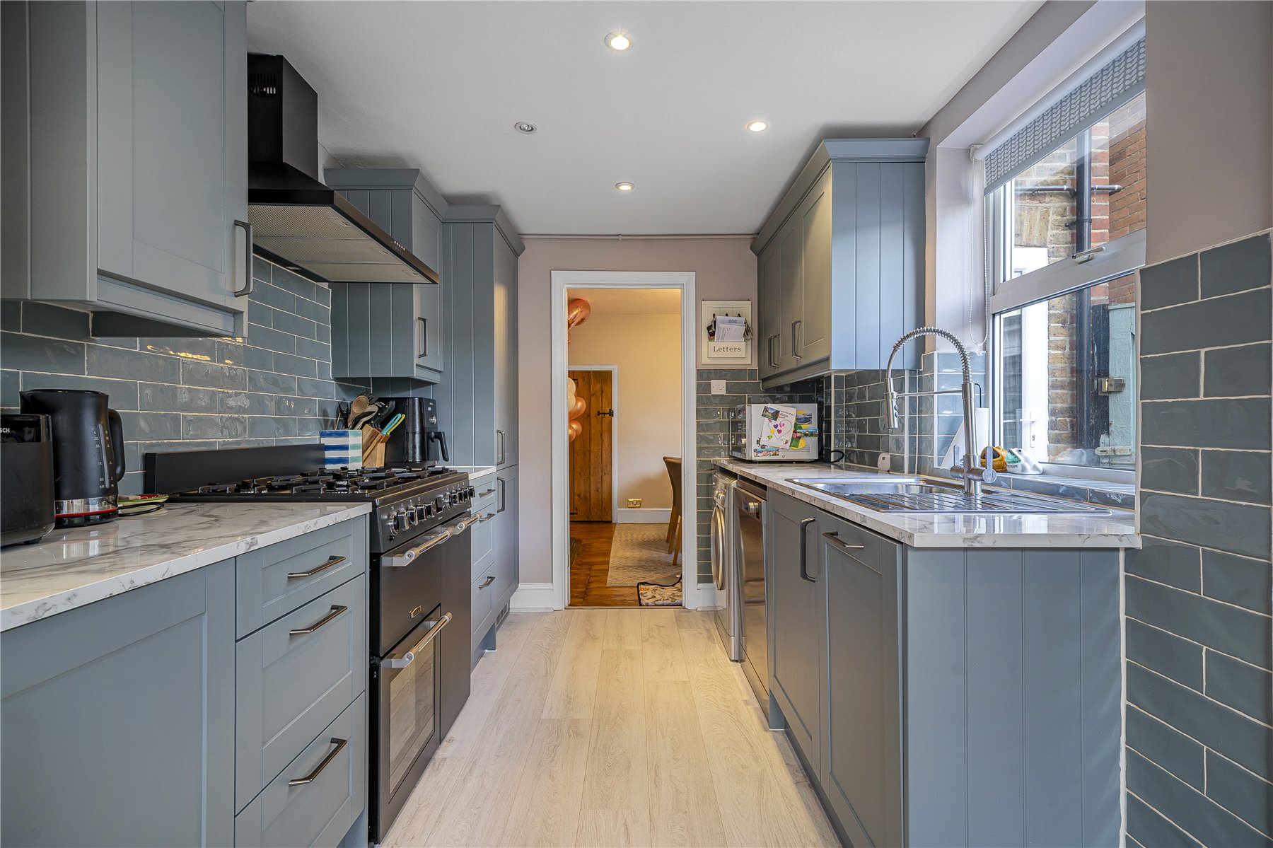 On the ground floor, the home provides two reception rooms. A comfortable living room sits to the front of the property, while the separate dining room offers an ideal space for entertaining. Both rooms feature attractive Victorian archway fireplaces and real wood flooring, adding to the home's character.
