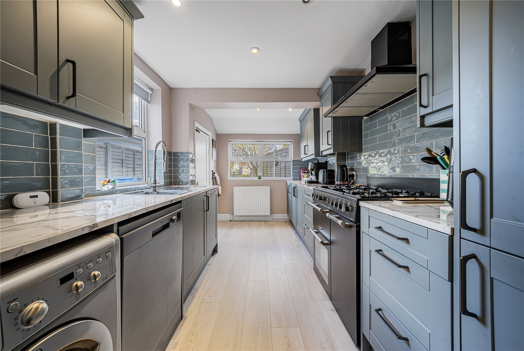 To the rear, the kitchen has been recently updated and is fitted with a range of shaker-style base and eye level units. It also benefits from an integrated fridge freezer and space for a range cooker, along with additional space for appliances.