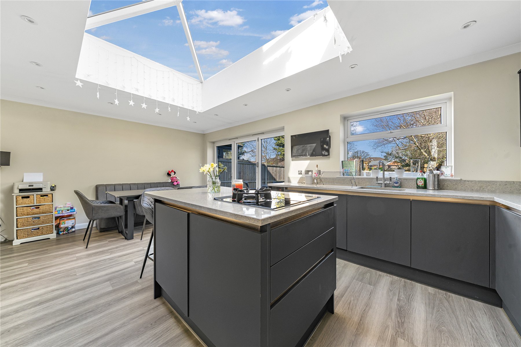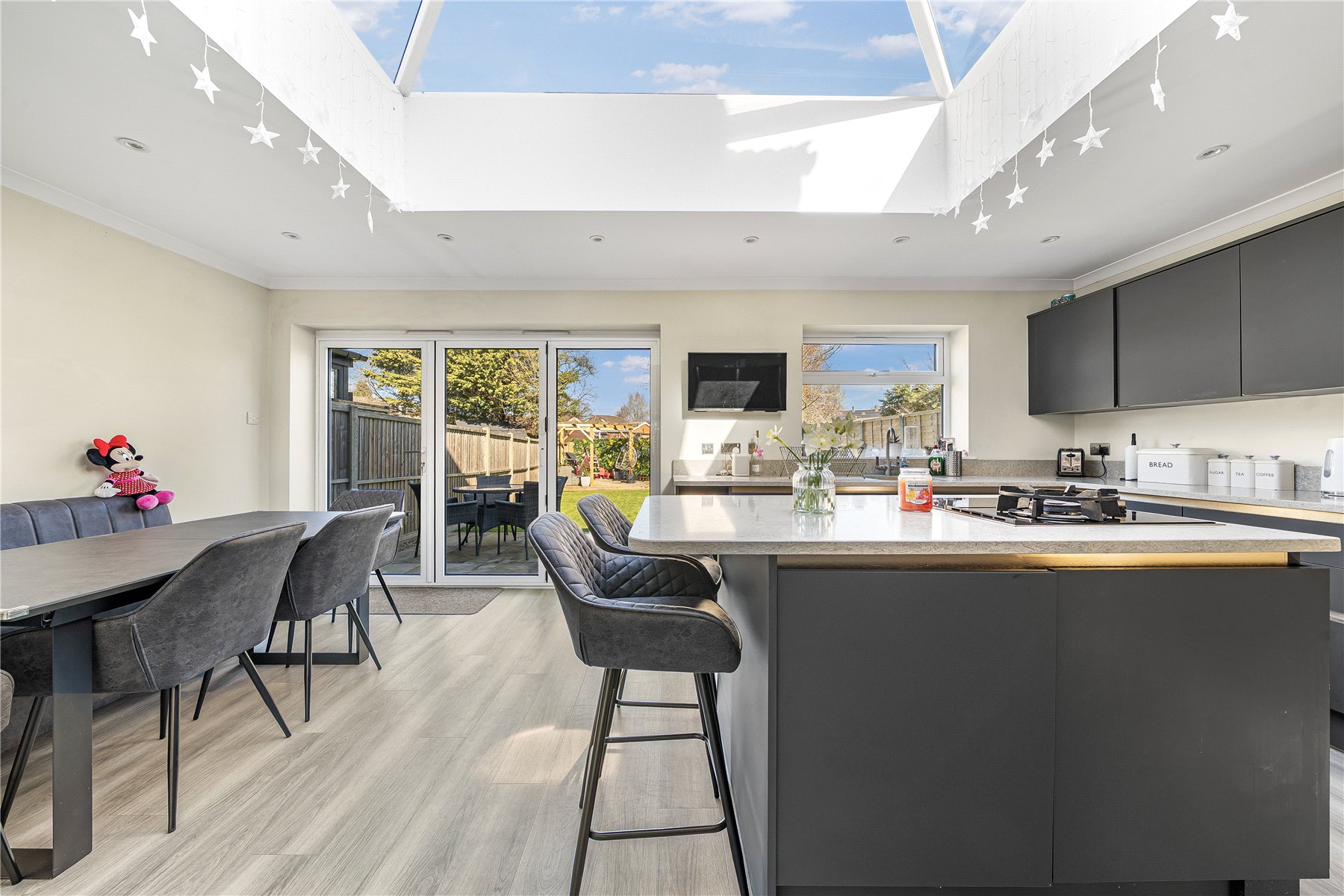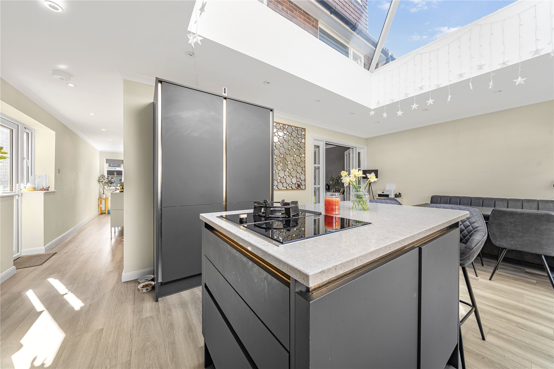 On the ground floor, there is a front aspect living room featuring a media wall. To the rear, a substantial extension has created a stunning open-plan kitchen/dining space, flooded with natural light from a large skylight lantern. Bi-folding doors open onto the garden, enhancing the indoor-outdoor living experience. The kitchen is fitted with a range of base and eye level units, stone worktops and integrated appliances, along with a large central island incorporating a gas hob, ideal for cooking and entertaining. A separate utility room and downstairs cloakroom completes the ground floor.