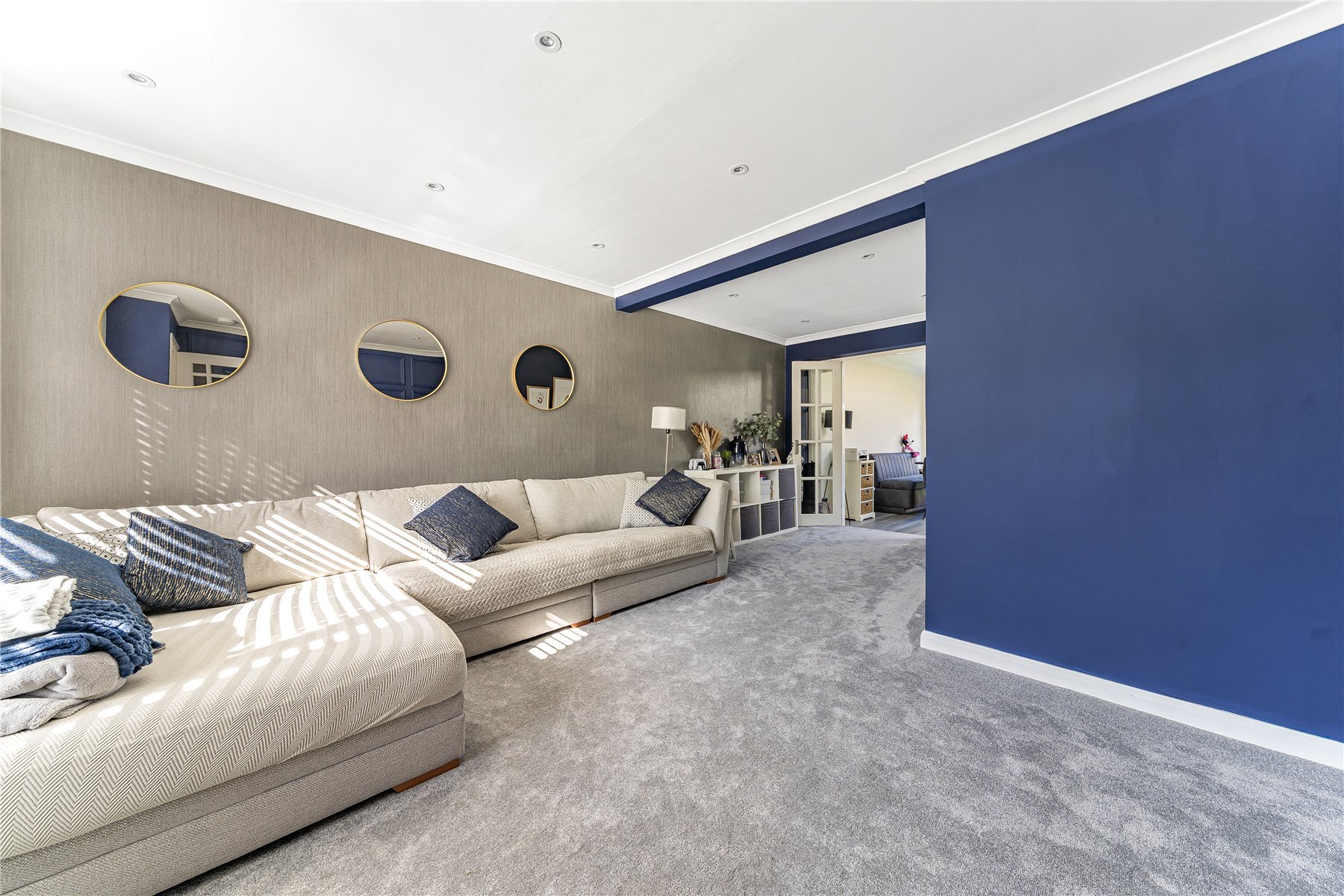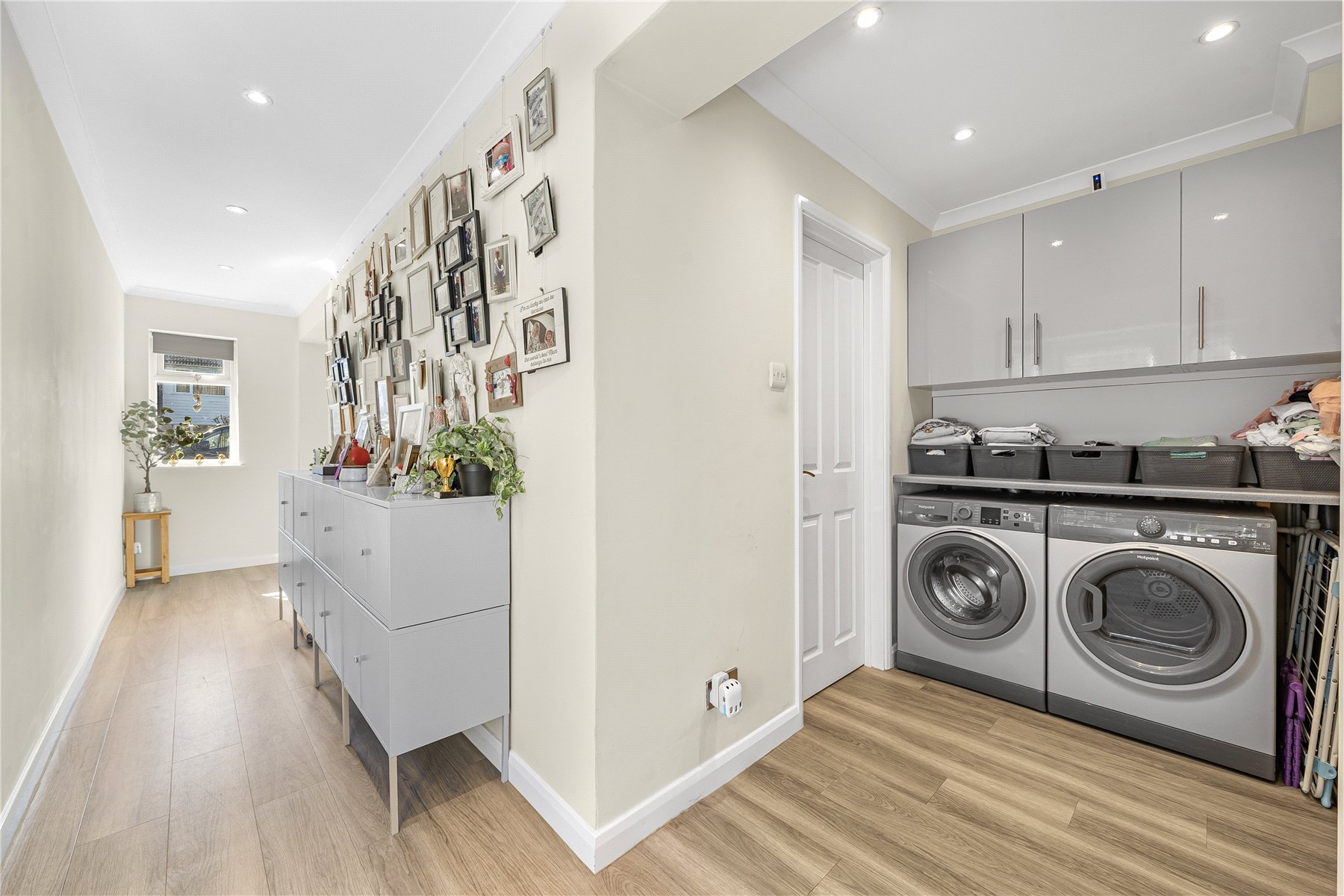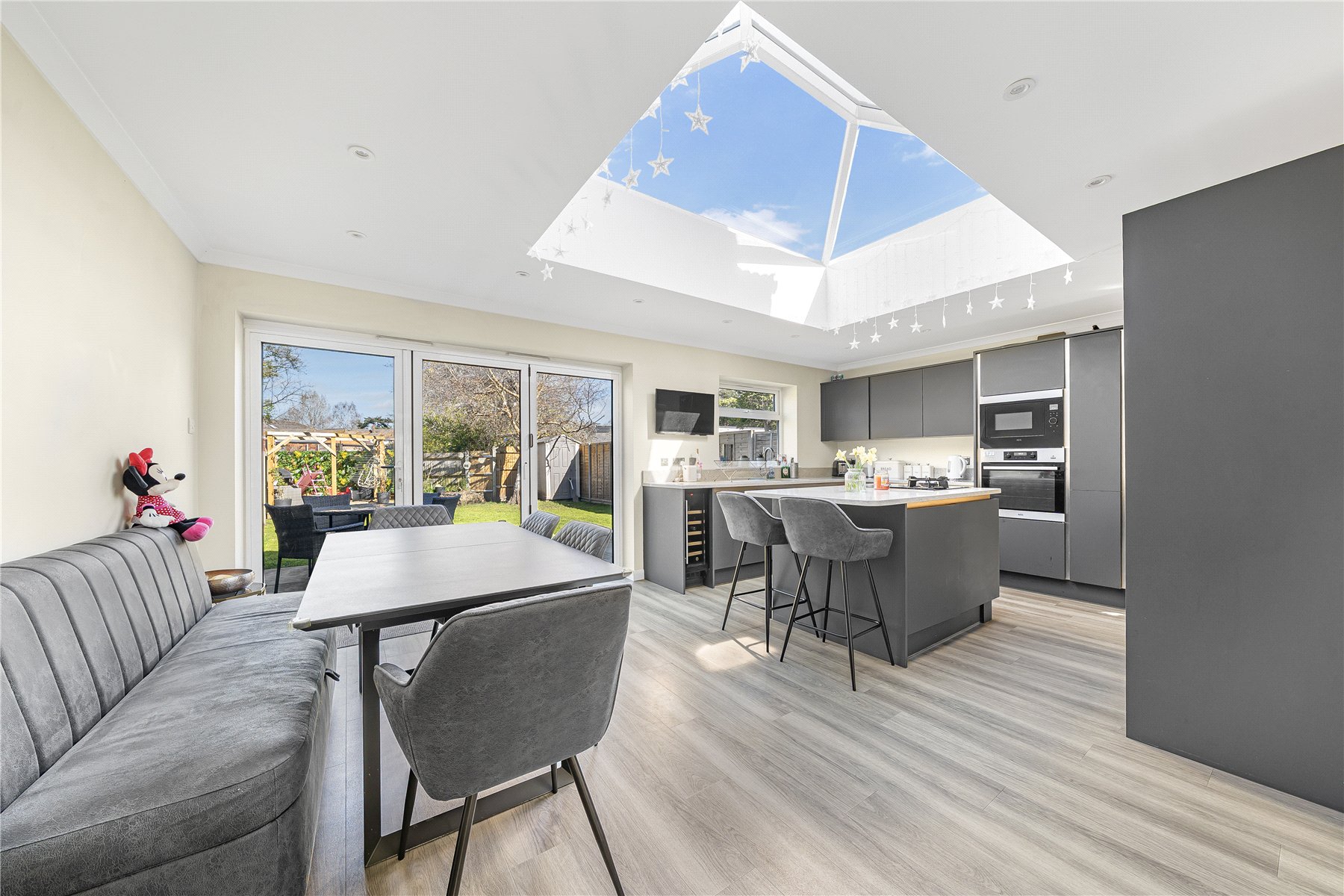 On the ground floor, there is a front aspect living room featuring a media wall. To the rear, a substantial extension has created a stunning open-plan kitchen/dining space, flooded with natural light from a large skylight lantern. Bi-folding doors open onto the garden, enhancing the indoor-outdoor living experience. The kitchen is fitted with a range of base and eye level units, stone worktops and integrated appliances, along with a large central island incorporating a gas hob, ideal for cooking and entertaining. A separate utility room and downstairs cloakroom completes the ground floor.