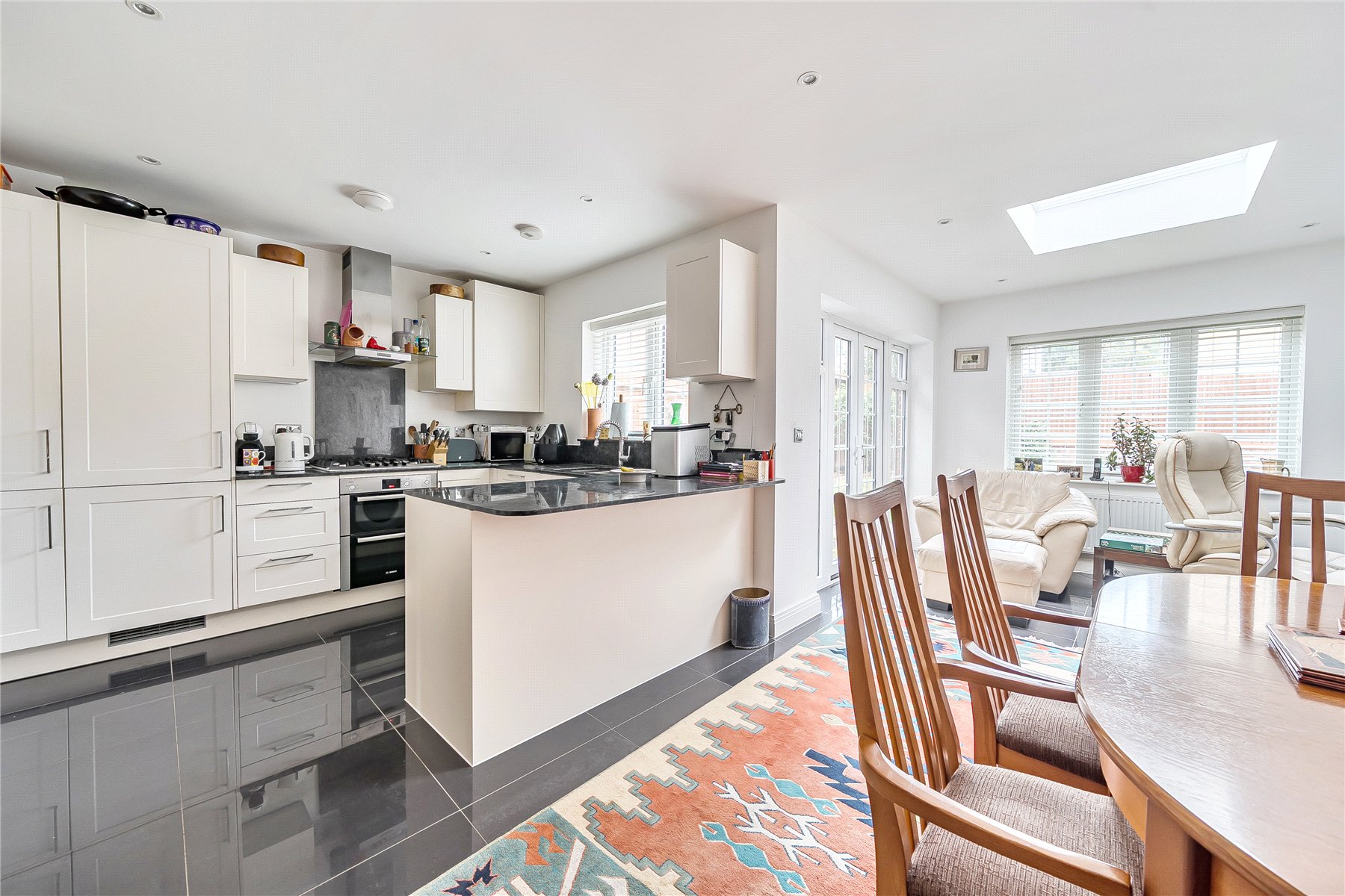 The ground floor comprises a bright front aspect living room, while to the rear is a striking open plan kitchen and dining area, perfectly suited to contemporary family living. The kitchen is fitted with a comprehensive range of base and wall units, complemented by elegant granite work surfaces.