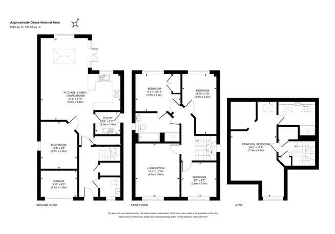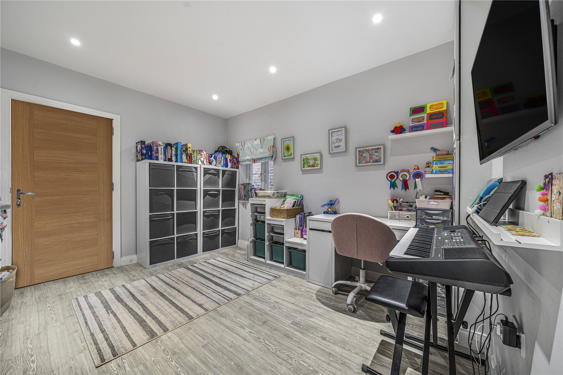 The garage has been partly converted, providing an additional reception room currently used as a playroom, while the front section retains valuable storage space.