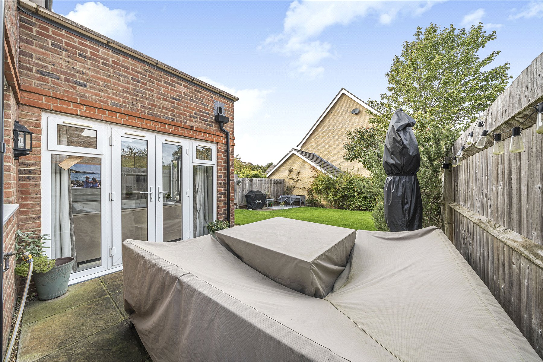 Outside, the private rear garden is mainly laid to lawn with two distinct patio areas, perfect for outdoor entertaining and relaxation. To the front, there is a driveway providing parking for two vehicles, along with an additional allocated parking space.