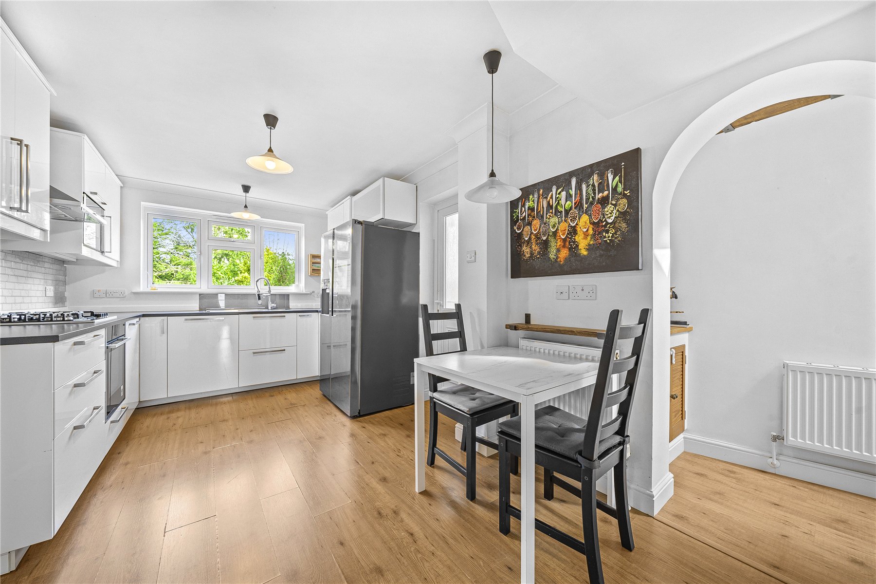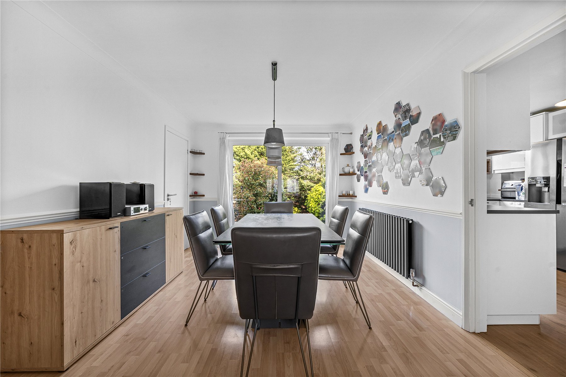 Downstairs, the property features a spacious front aspect living room with a feature fireplace and attractive bay window. From here, there is access to a separate dining room with sliding doors opening onto the garden, allowing plenty of natural light to flow through the space. Adjoining the dining room is a well-appointed kitchen, fitted with a range of base and eye level units, an integrated oven with gas hob and an integrated dishwasher. There is also space for a breakfast table and a door providing direct access to the outside.