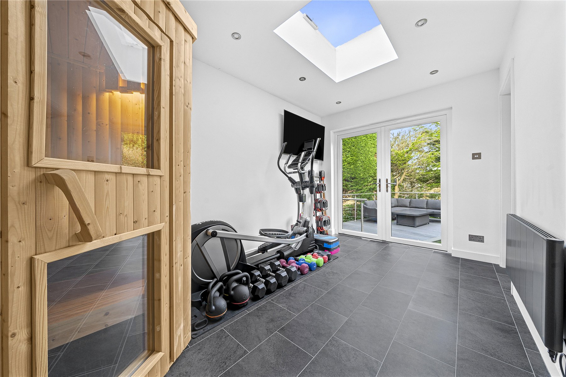 A double length garage has been partially converted to create a versatile home office or gym, complete with a private sauna, while still retaining garage storage space.