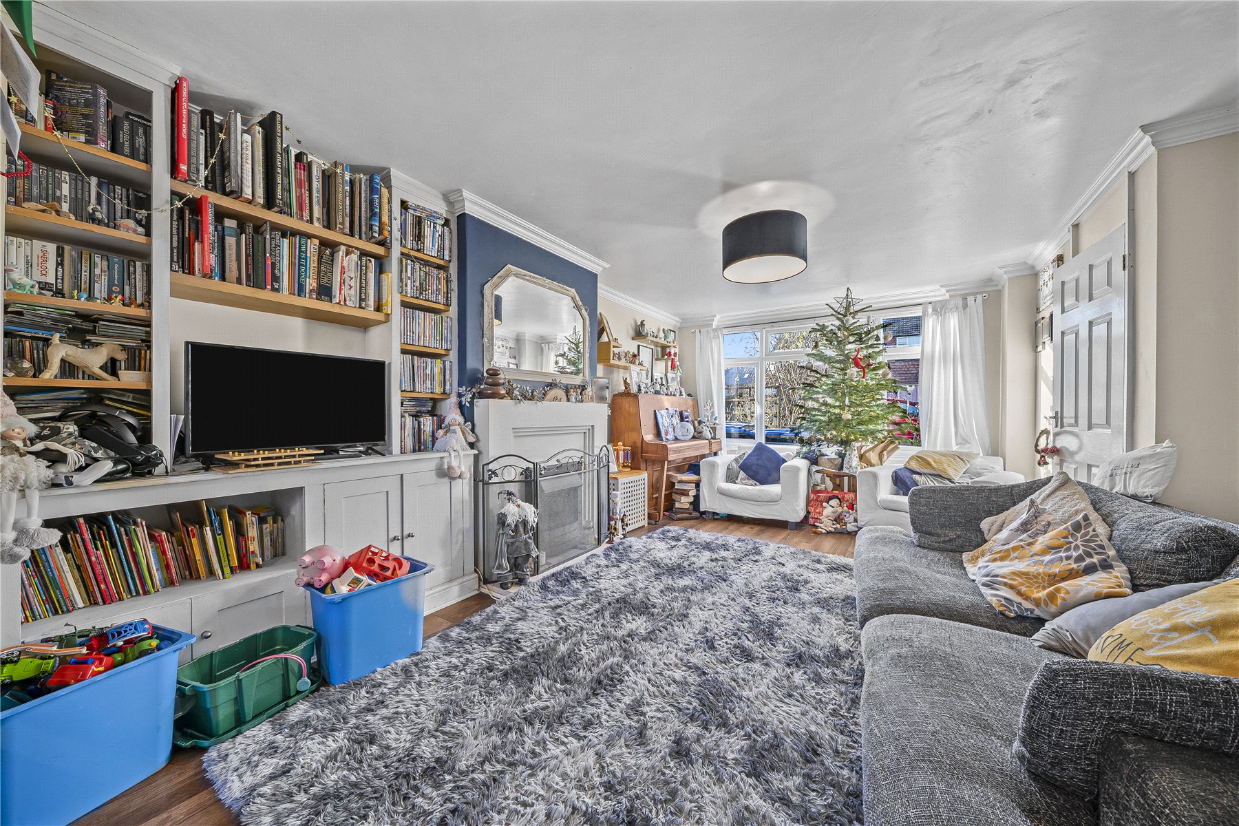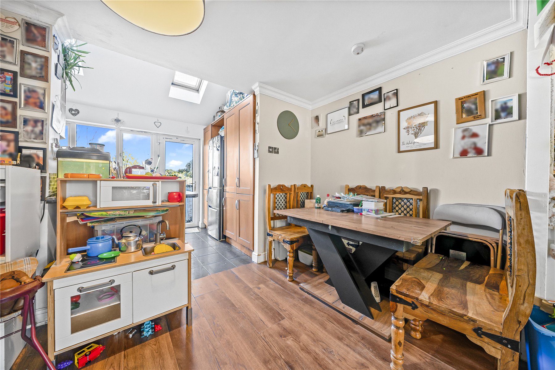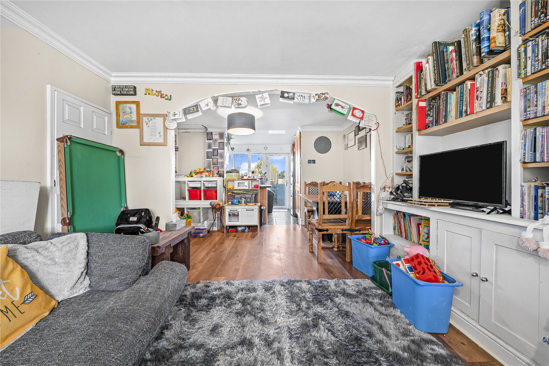 The ground floor comprises a welcoming front aspect lounge, enhanced by bespoke fitted shelving and units that provide both style and practical storage. To the rear, a thoughtfully designed extension has created a spacious open-plan kitchen and dining area, forming the heart of the home and offering an excellent space for everyday living and entertaining, with views over the rear garden.