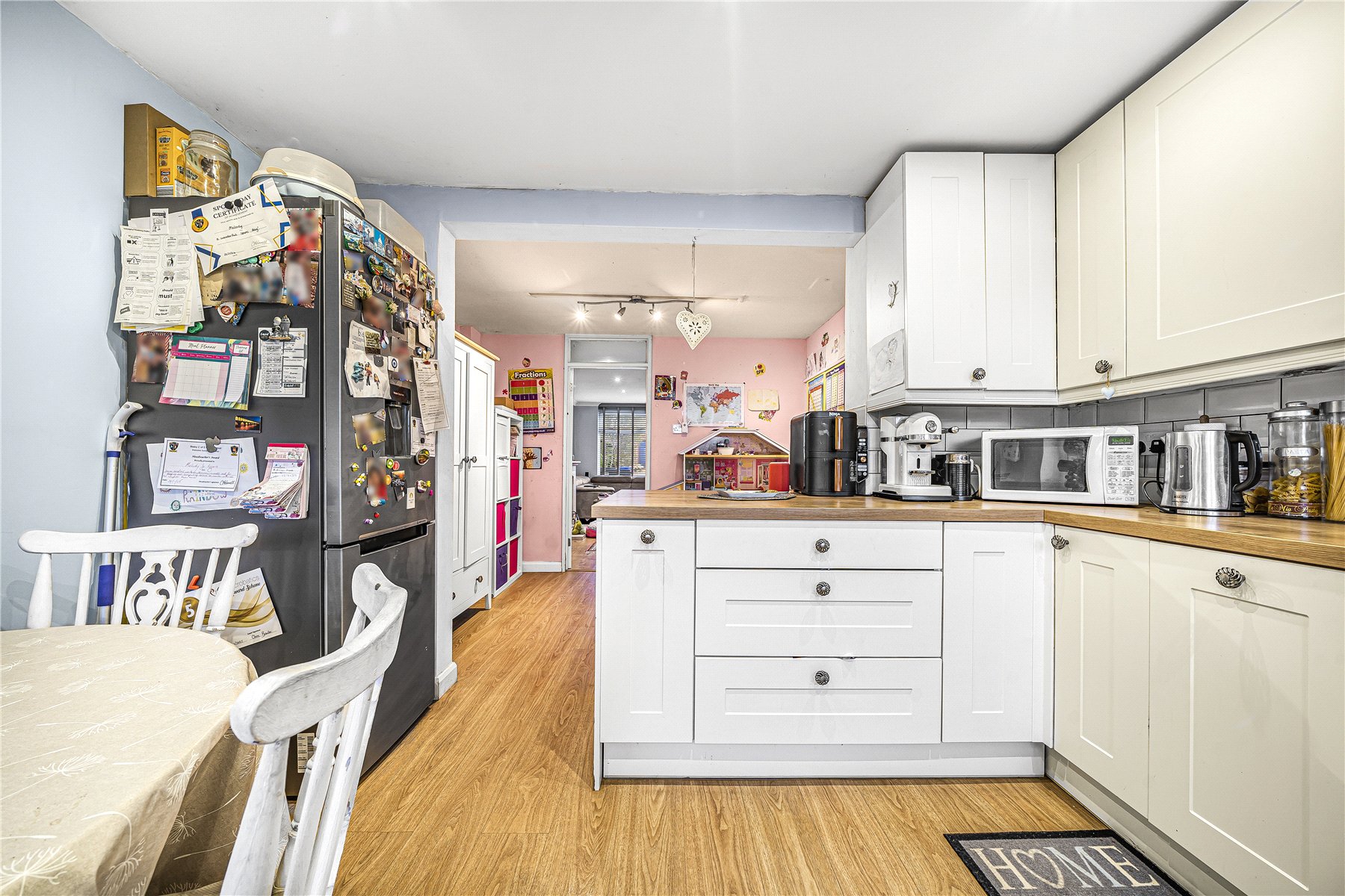On the ground floor, a welcoming front-aspect lounge features a charming fireplace, creating a cosy focal point. An impressive rear extension has transformed the space, providing a bright and open-plan kitchen/dining room. The kitchen is fitted with stylish shaker-style base and eye-level units, along with an integrated oven with gas hob and an integrated dishwasher.