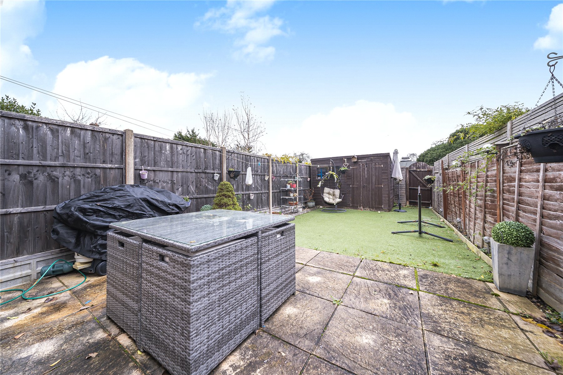 Outside, the property enjoys a private rear garden laid with artificial grass and a patio area, ideal for outdoor entertaining with minimal maintenance. To the front, a block-paved driveway provides parking for two cars. A garage in a nearby block is a further benefit.