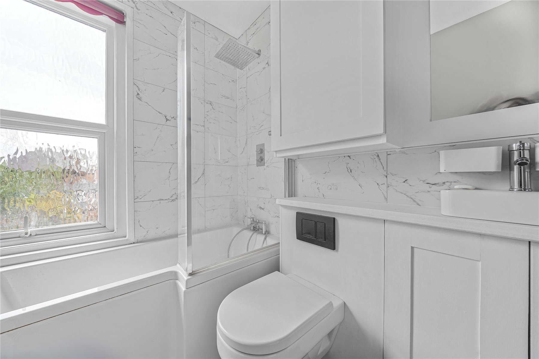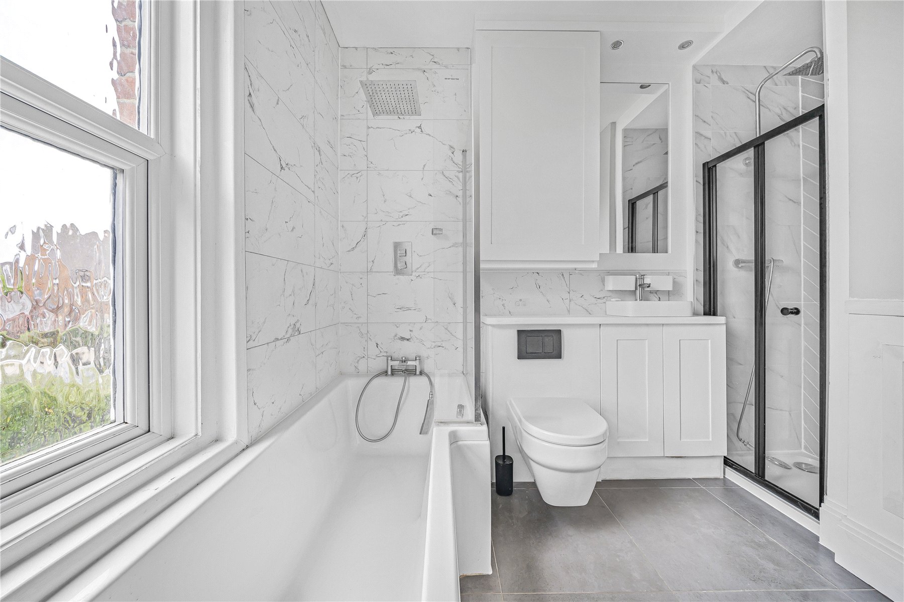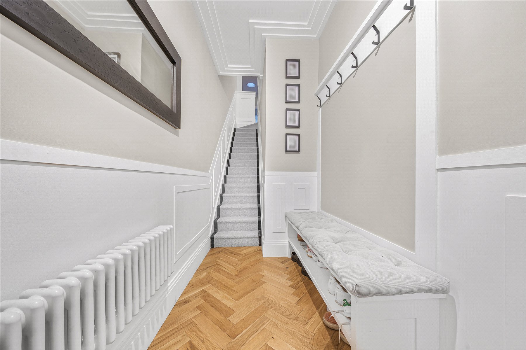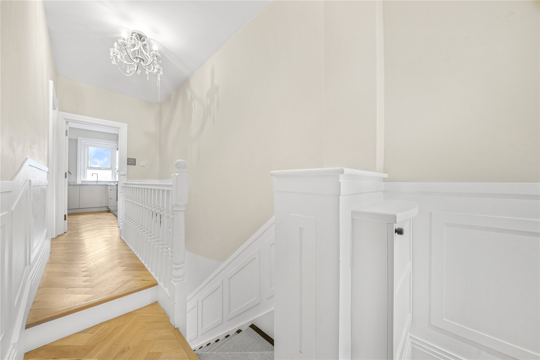 Accessed via its own private front door, the property opens into a welcoming entrance hall featuring engineered oak wood flooring, which continues up to the first-floor landing and through the main living space. The first-floor landing leads to all rooms, including two bedrooms. The principal bedroom is a generous double, complemented by an excellent range of built-in wardrobes. Both bedrooms share the use of a modern four-piece bathroom, fitted with a vanity unit and wash hand basin, WC, separate shower, and bath.
