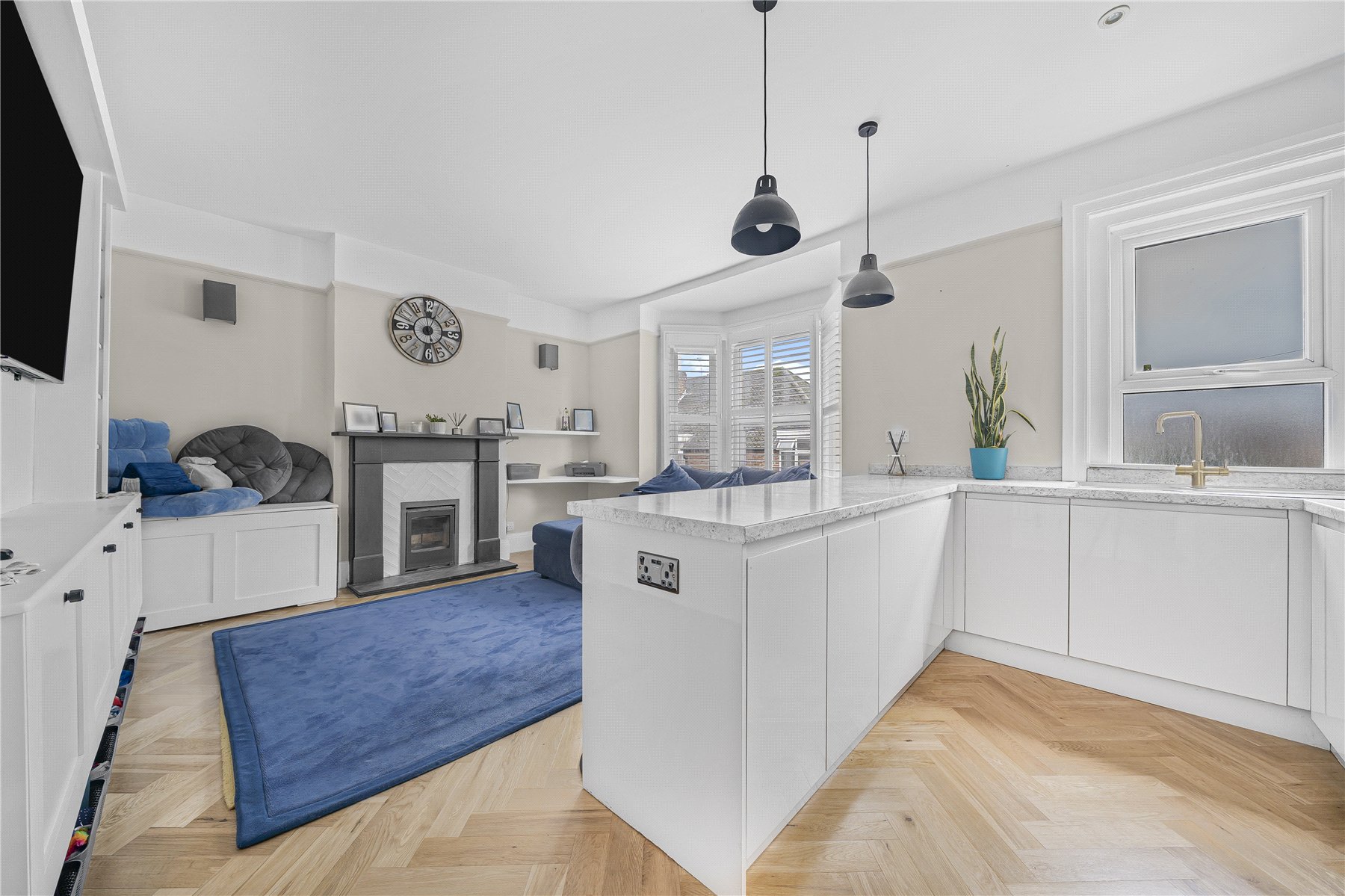 The main living area is an impressive open-plan space combining the lounge and kitchen. The lounge enjoys a charming feature fireplace, bay window, and a bespoke entertainment unit. The contemporary kitchen is fitted with a range of units, integrated appliances, and a breakfast bar with seating for three. For added comfort, underfloor heating is installed in both the kitchen and bathroom.