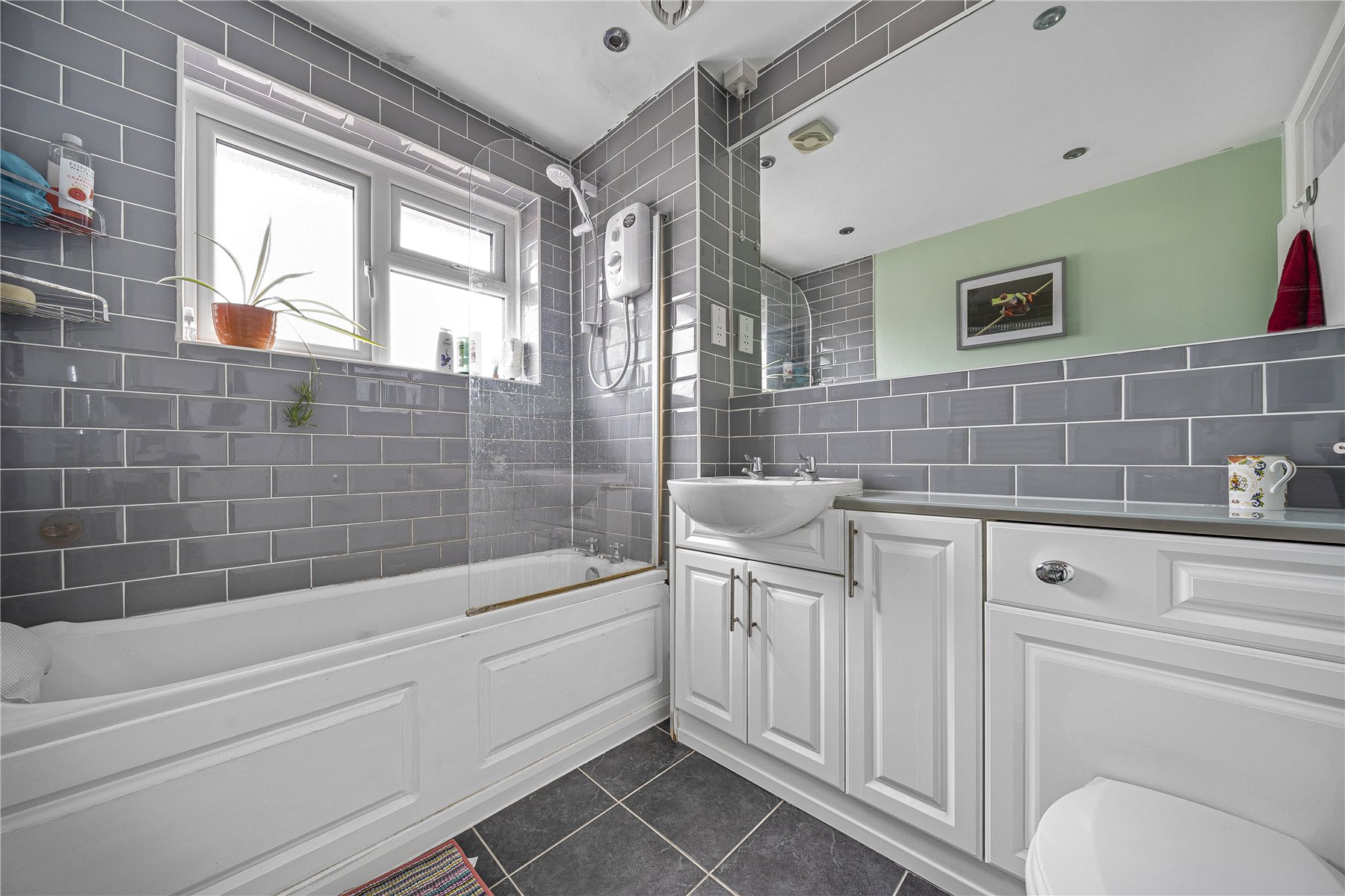 A modern three piece bathroom completes the accommodation, featuring white sanitary ware, stylish wall tiling, and a large mirror.