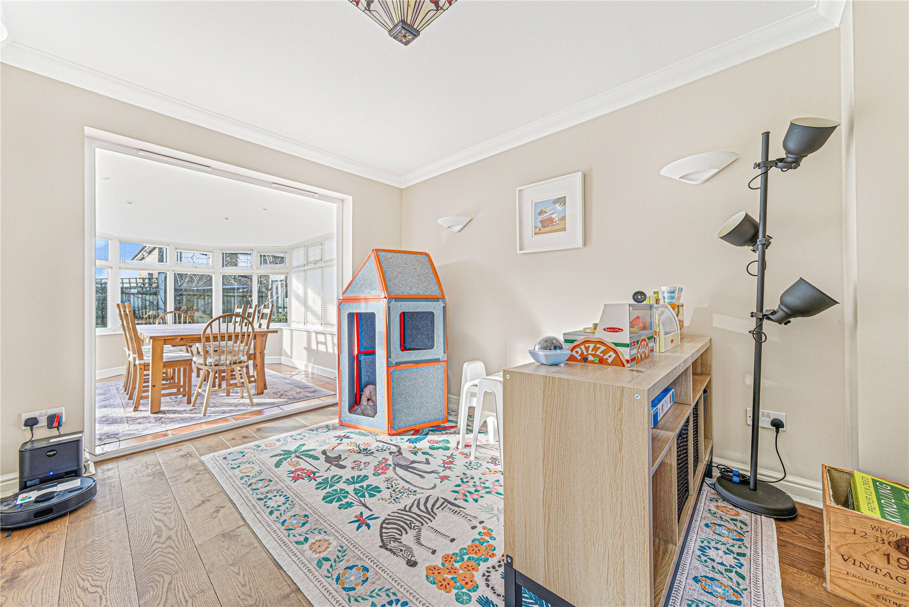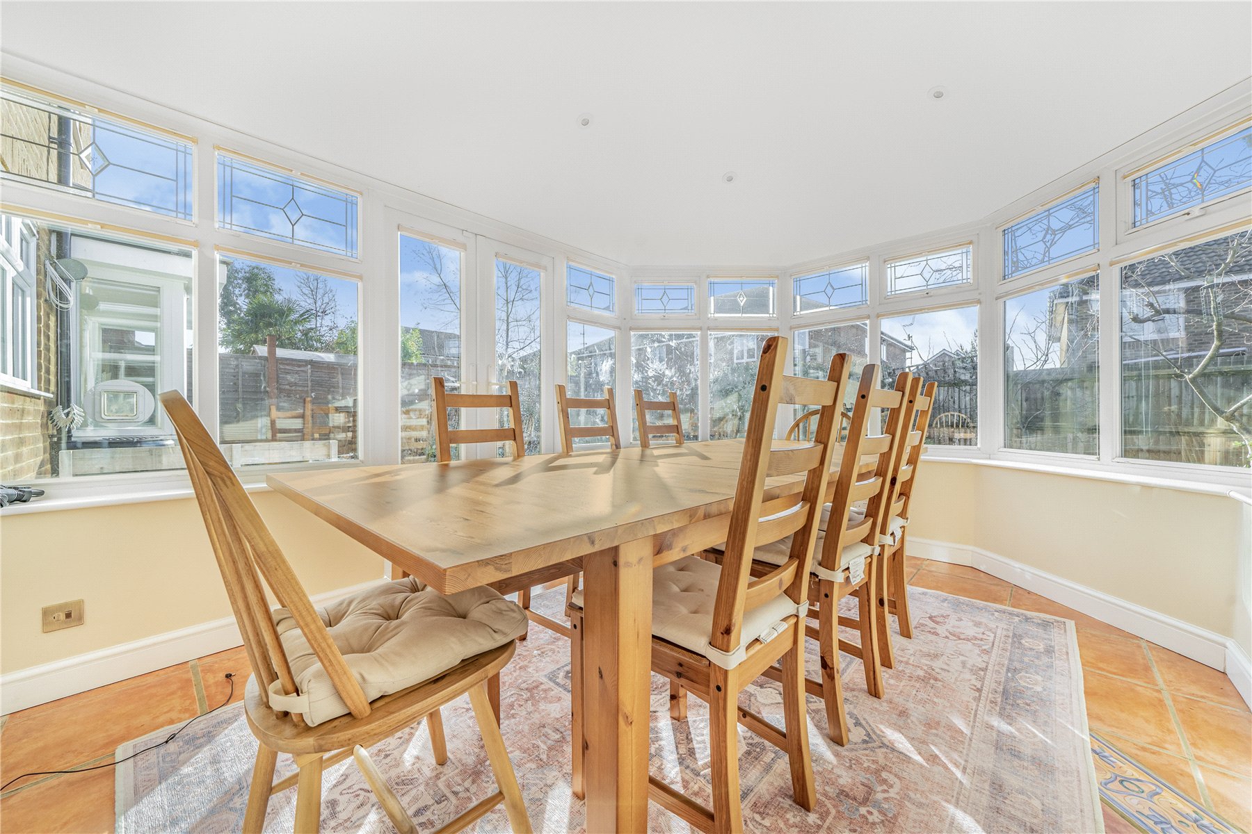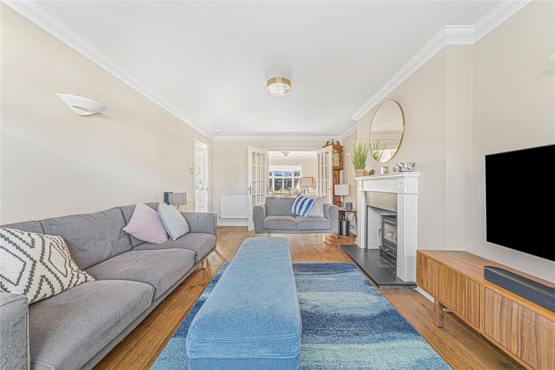The ground floor offers excellent living and entertaining space. A spacious front aspect living room features a charming fireplace fitted with a log burner, while an adjoining reception room is currently utilised as a family room. To the rear, a conservatory with a solid roof provides a comfortable year-round dining area and enjoys views over the garden.