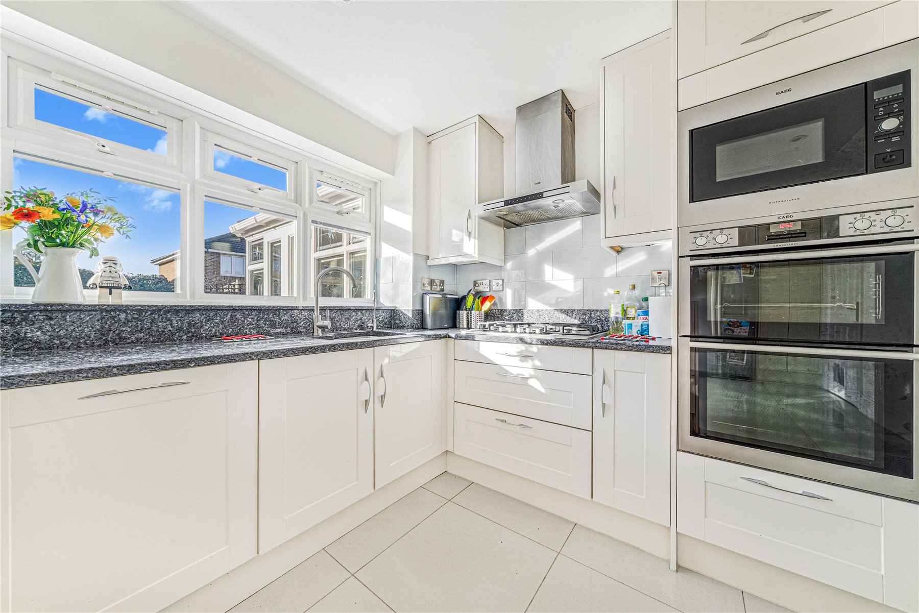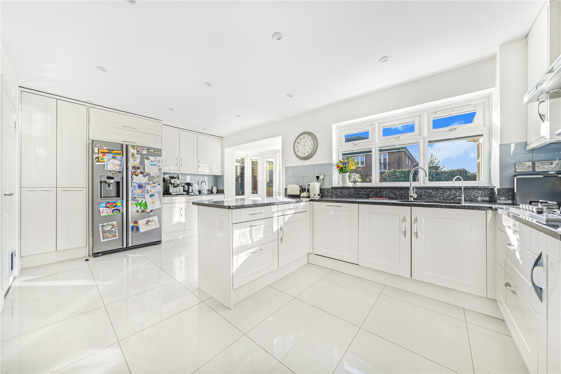 The stunning kitchen is fitted with an extensive range of shaker style units, complemented by granite worktops. Integrated appliances include a double oven, gas hob, fridge/freezer and dishwasher, while a breakfast bar offers informal seating. A downstairs cloakroom and utility room with underfloor heating complete the internal accommodation.