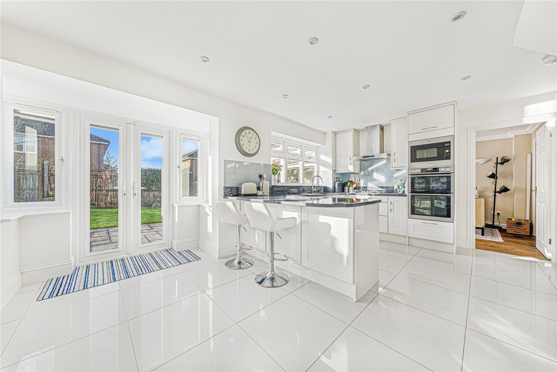 On the first floor, there are four double bedrooms. The principal suite benefits from built-in wardrobes and a recently updated ensuite shower room. The remaining bedrooms are served by a neat and well appointed family bathroom fitted with a modern three piece suite.