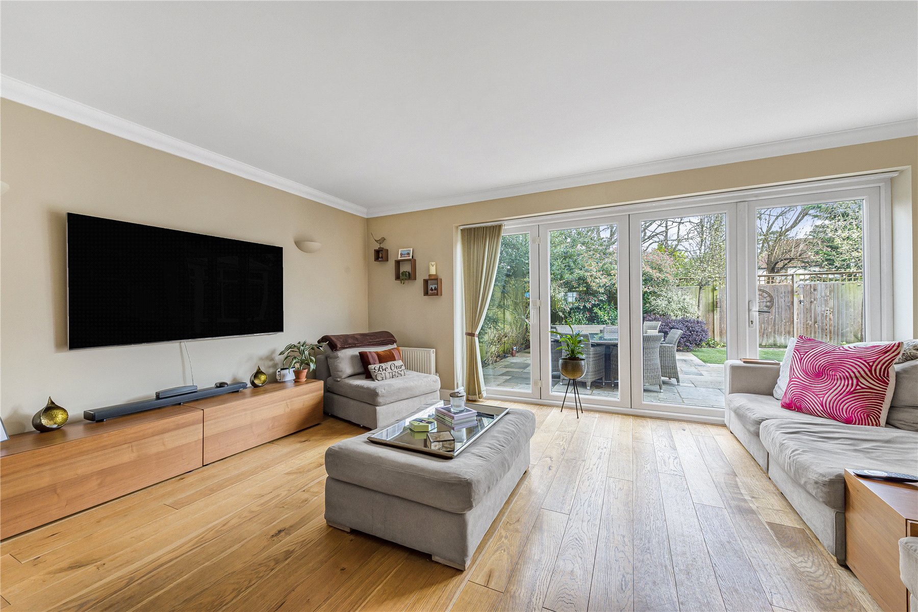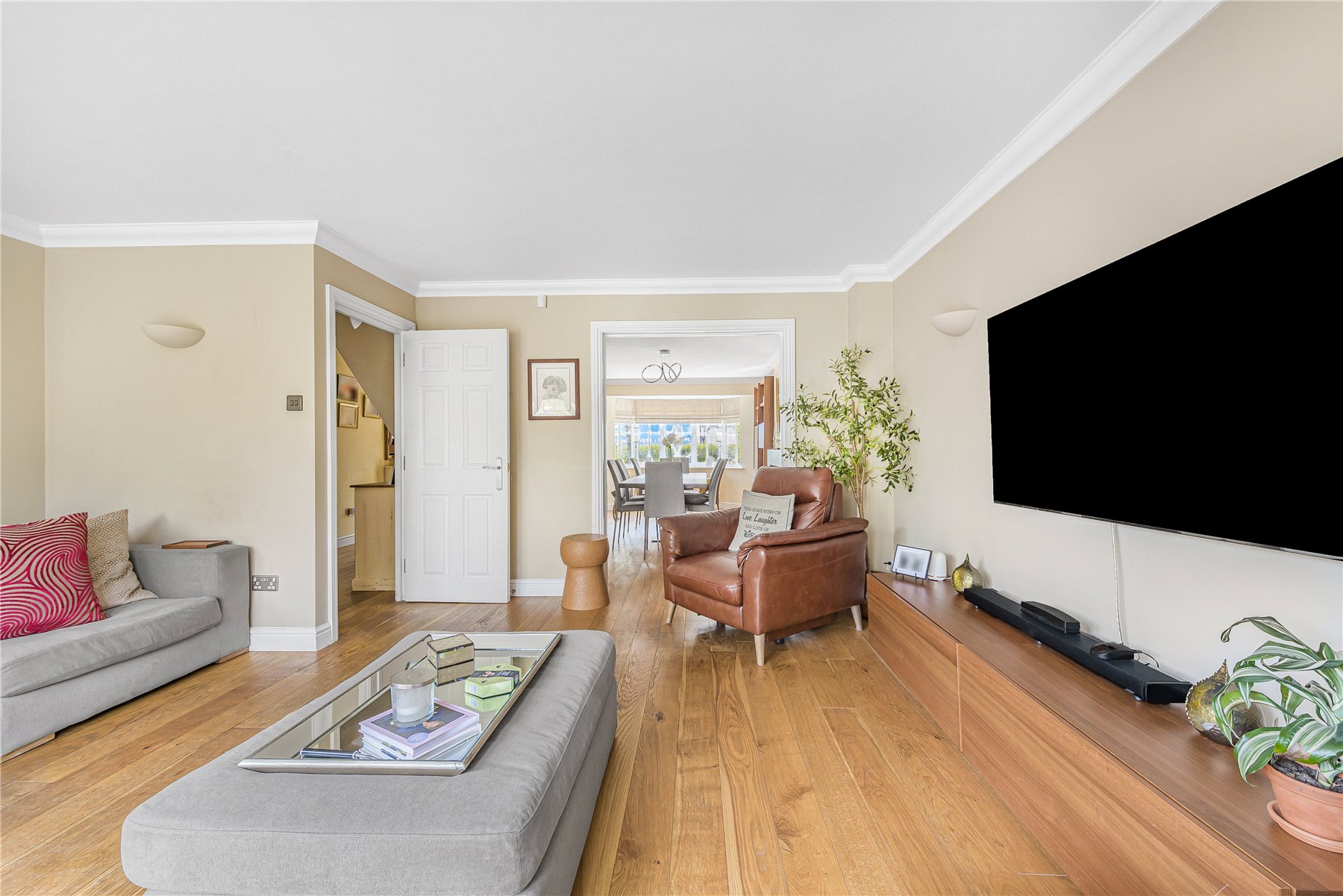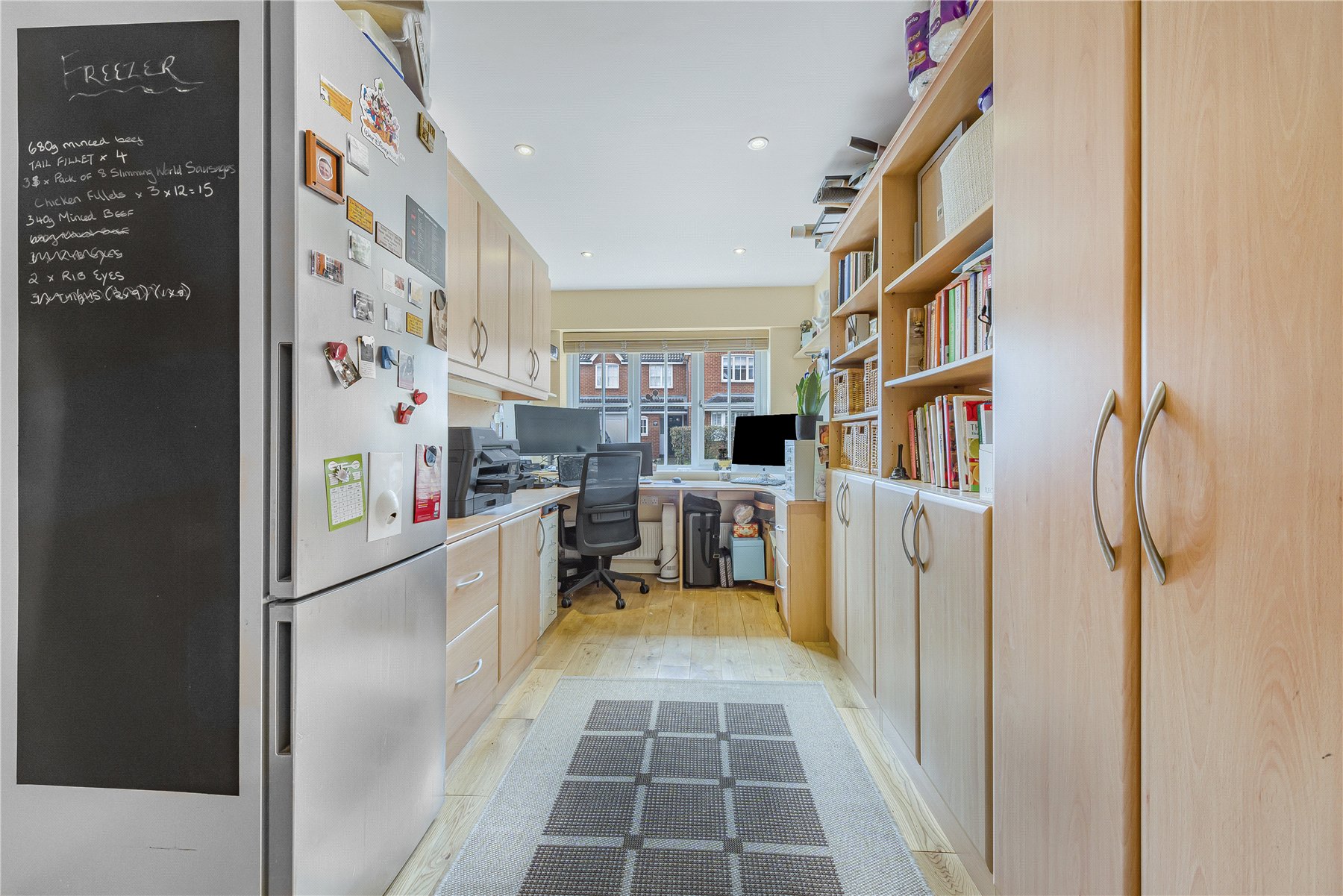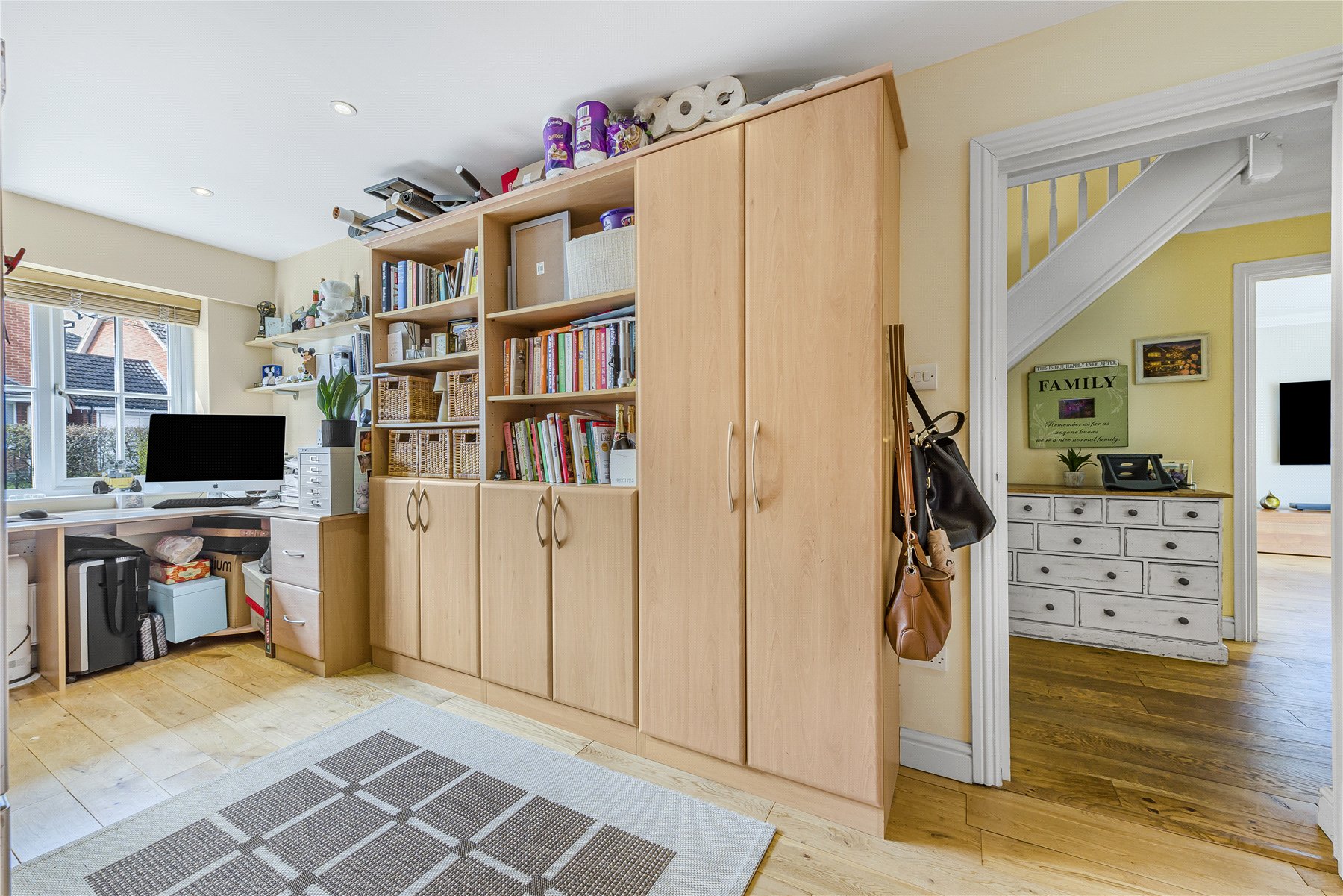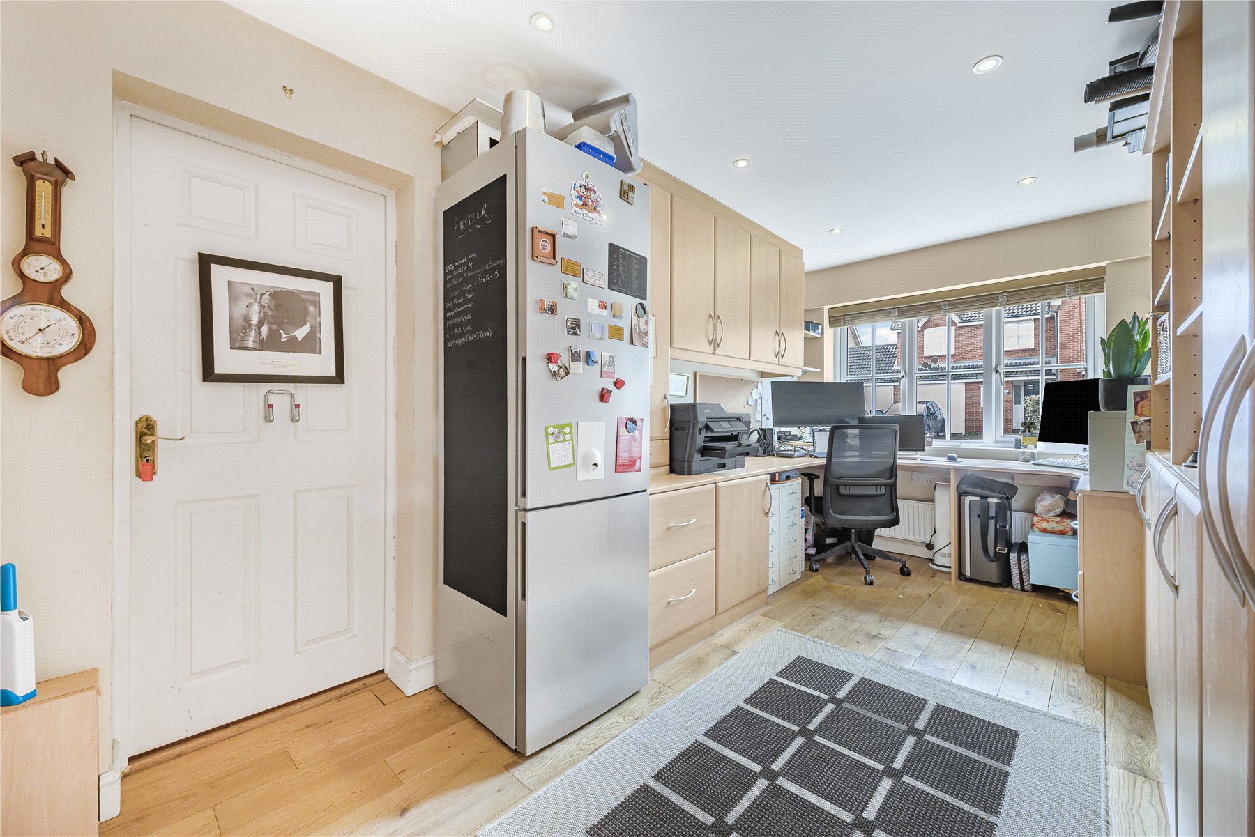 The ground floor offers excellent living and entertaining space. A welcoming rear aspect living room features bi-folding doors that open directly onto the garden, seamlessly blending indoor and outdoor living. There are two further reception rooms, including a formal dining room and a study, the latter enhanced by bespoke fitted cupboards and desk space, created through a garage conversion.