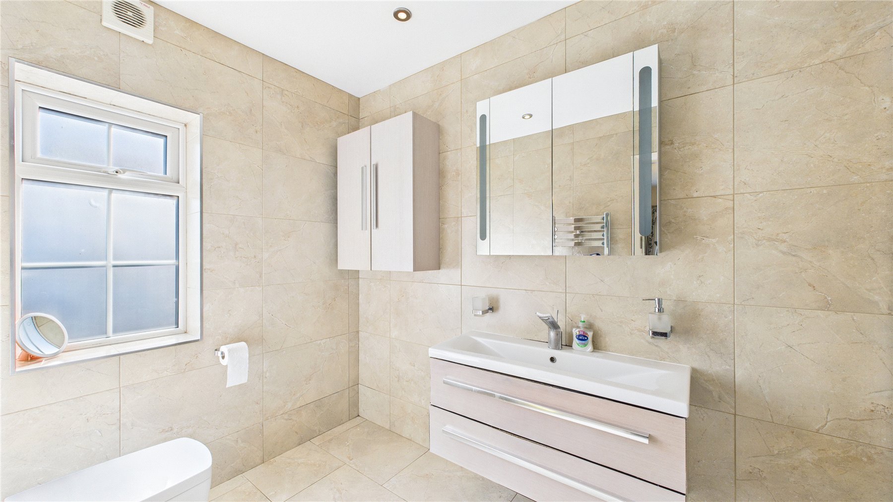 Cloakroom Fully tiled walls and floor, low level WC, chrome heated towel rail, vanity basin, extractor fan.
