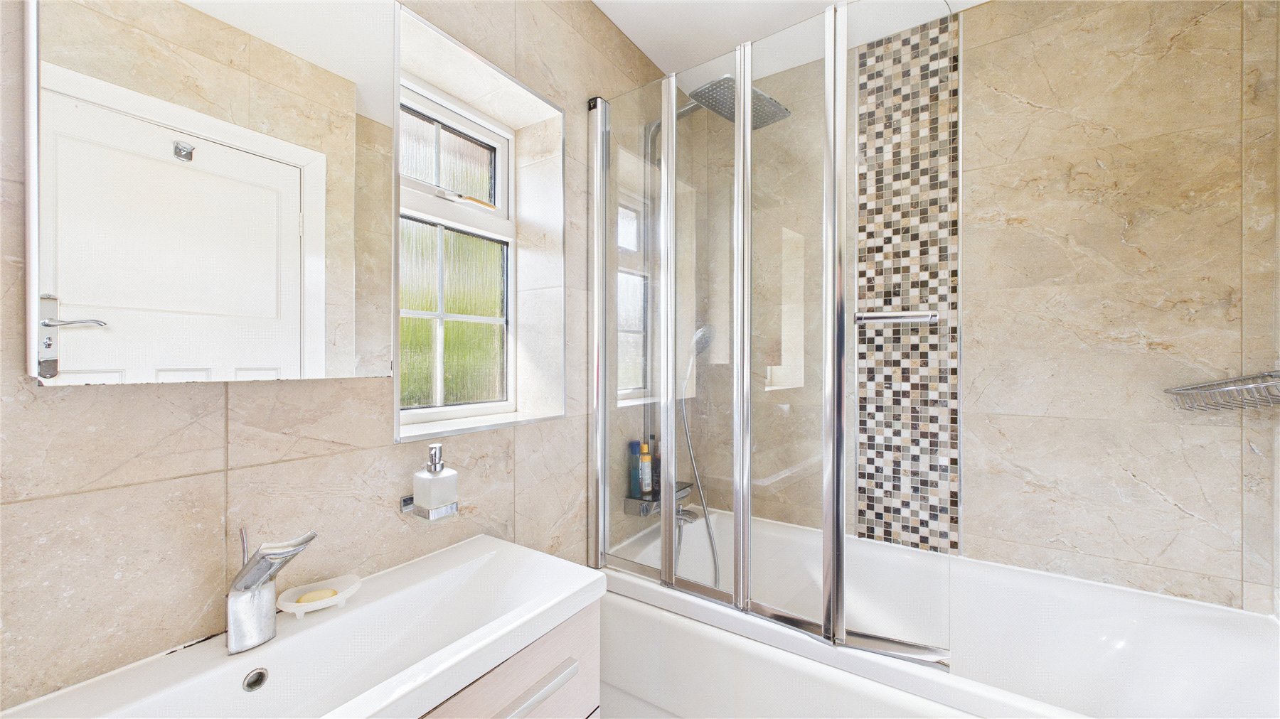Family Bathroom Fully tiled floor to ceiling, three piece suite comprising of low level WC, vanity basin, panel enclosed bath with retractable glass panelled shower screen, two front aspect obscured double glazed windows, chrome heated towel rail and extractor fan.