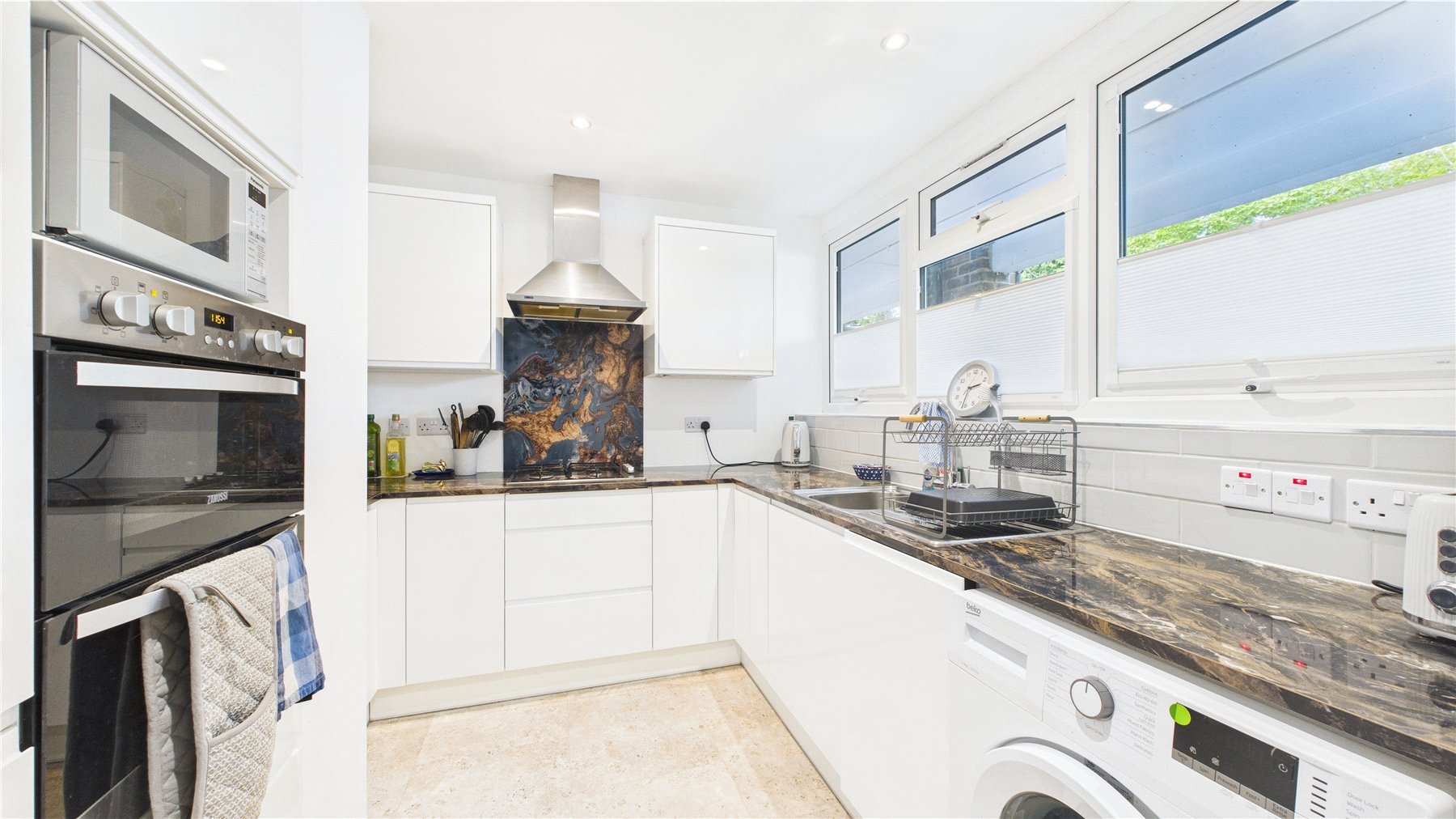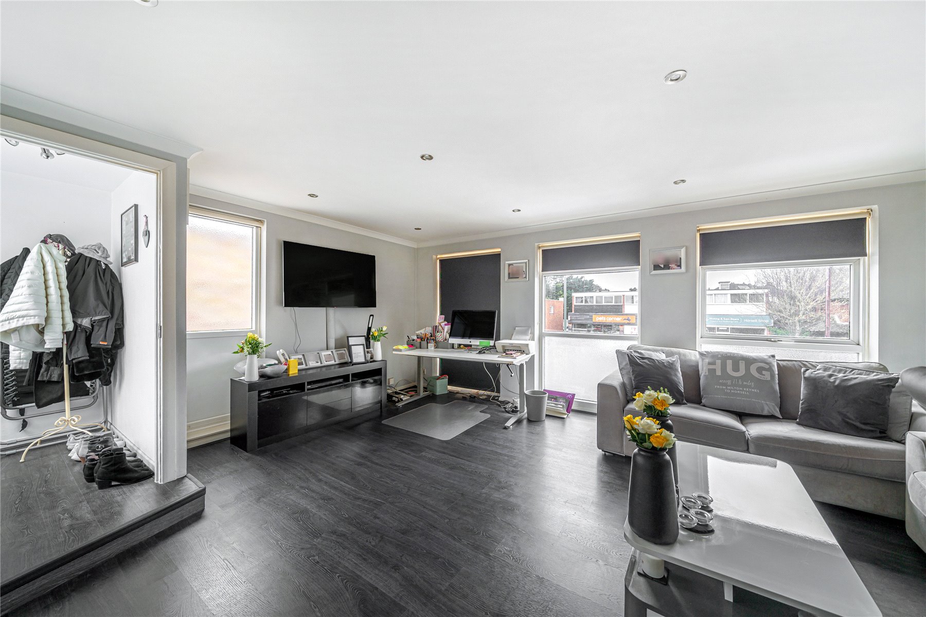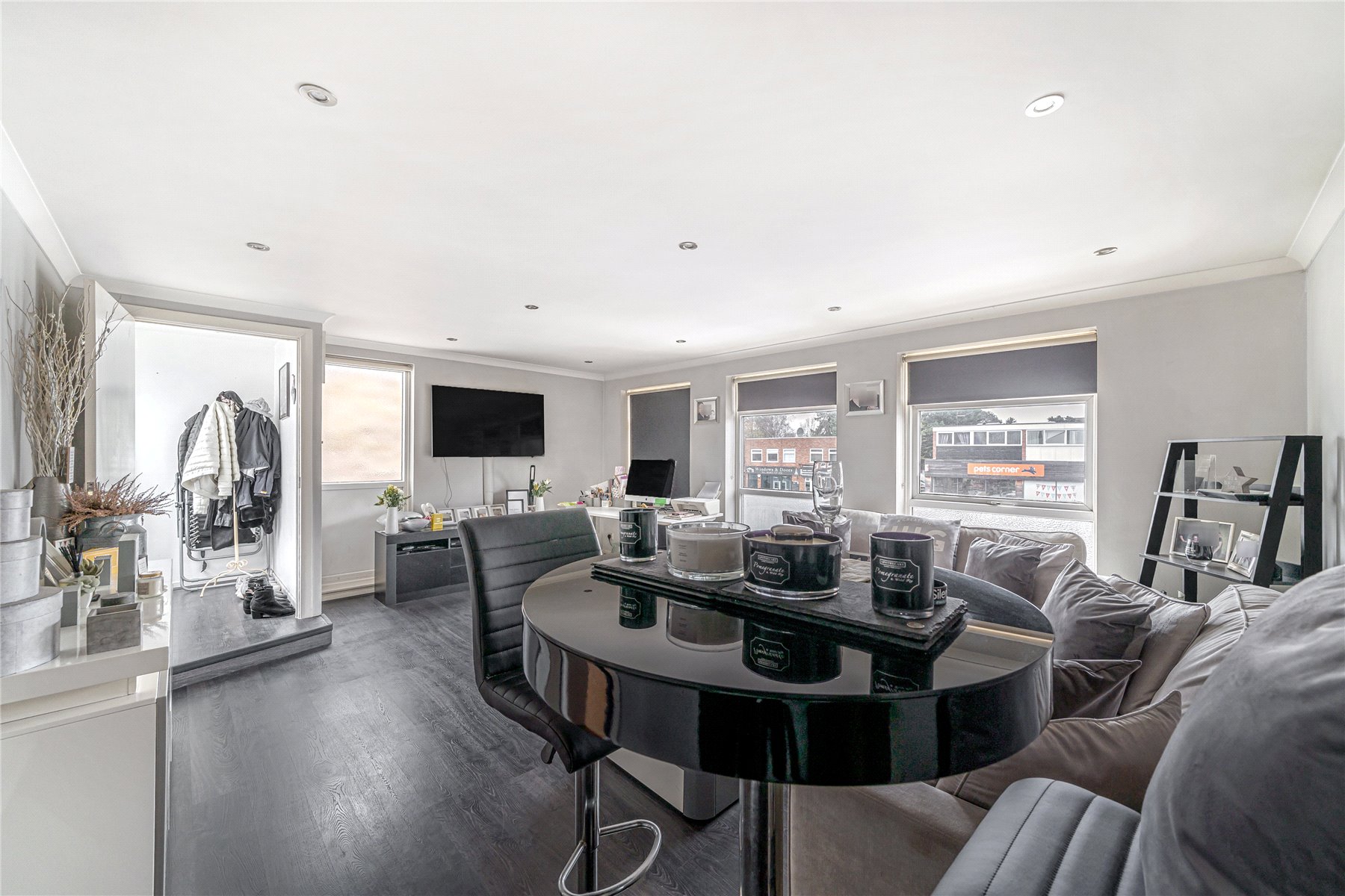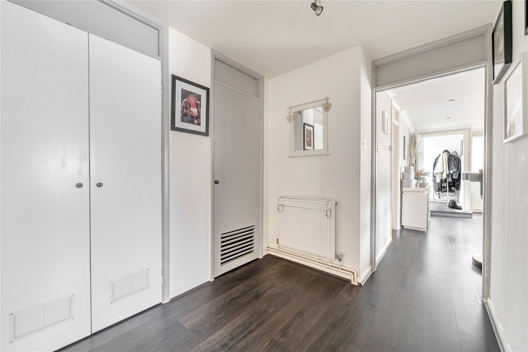 The entrance is privately situated at the rear of the development. You enter the property via an enclosed porch, leading into a bright dual-aspect, living/dining room that measures in excess of 18ft with striking laminate flooring and a separate Kitchen/Dining room with plenty of space for a dining table. Continuing into the hallway the property benefits from a number of storage cupboards. There are two double bedrooms, the principal bedroom measuring in excess of 14ft. The accommodation is completed with a four-piece family bathroom, with a skylight providing natural light.