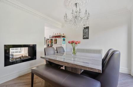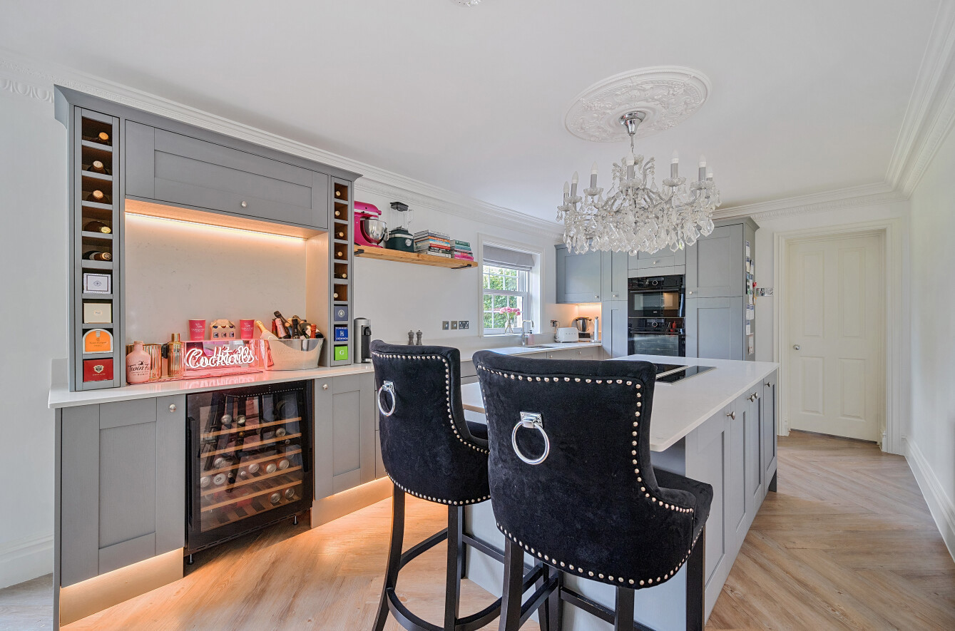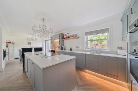 Designed with light and open-plan spaces in mind, the fabulous kitchen/dining area is the heart of the home and a perfect entertaining space. The recently installed kitchen features a sociable large island, plenty of bespoke storage solutions and quality integrated appliances. A stunning double-sided gas fireplace features in both the dining area and family snug/sitting room. Steel grey bi-fold doors lead to the garden and flood the property with natural light. Additionally, there is a separate utility room and ground floor shower room.