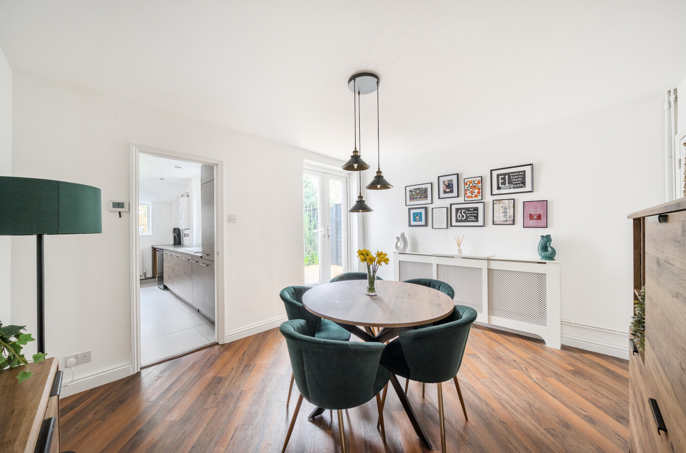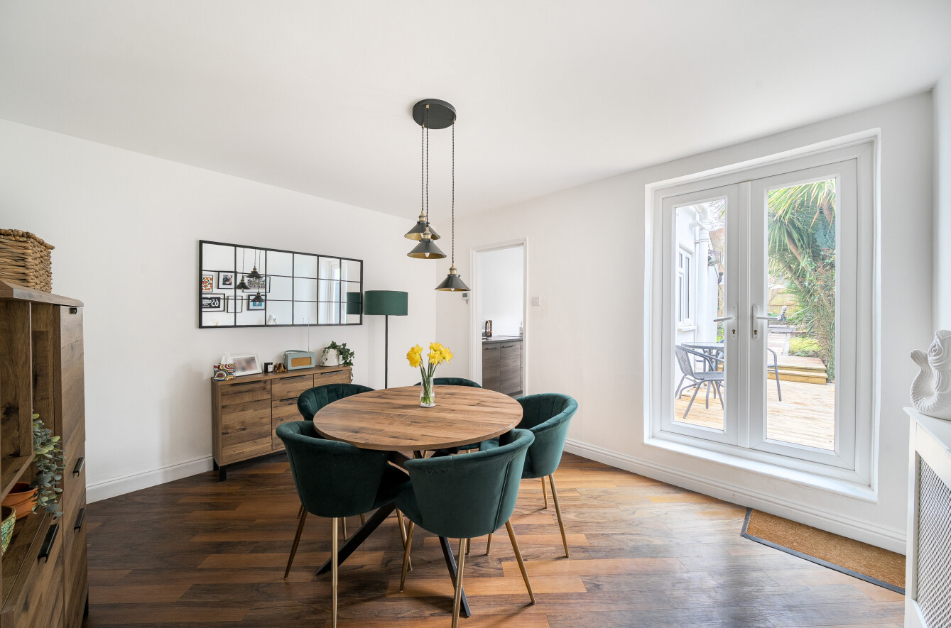 The property is superbly presented throughout and retains a wealth of character alongside stylish modern finishes. The ground floor features an elegant front-aspect living room with a feature fireplace, bay window with plantation shutters, and bespoke fitted shelving, cupboards and a cleverly designed fold-down desk. To the rear, the dining room enjoys views over the garden and provides access to the kitchen, as well as double doors opening directly outside.