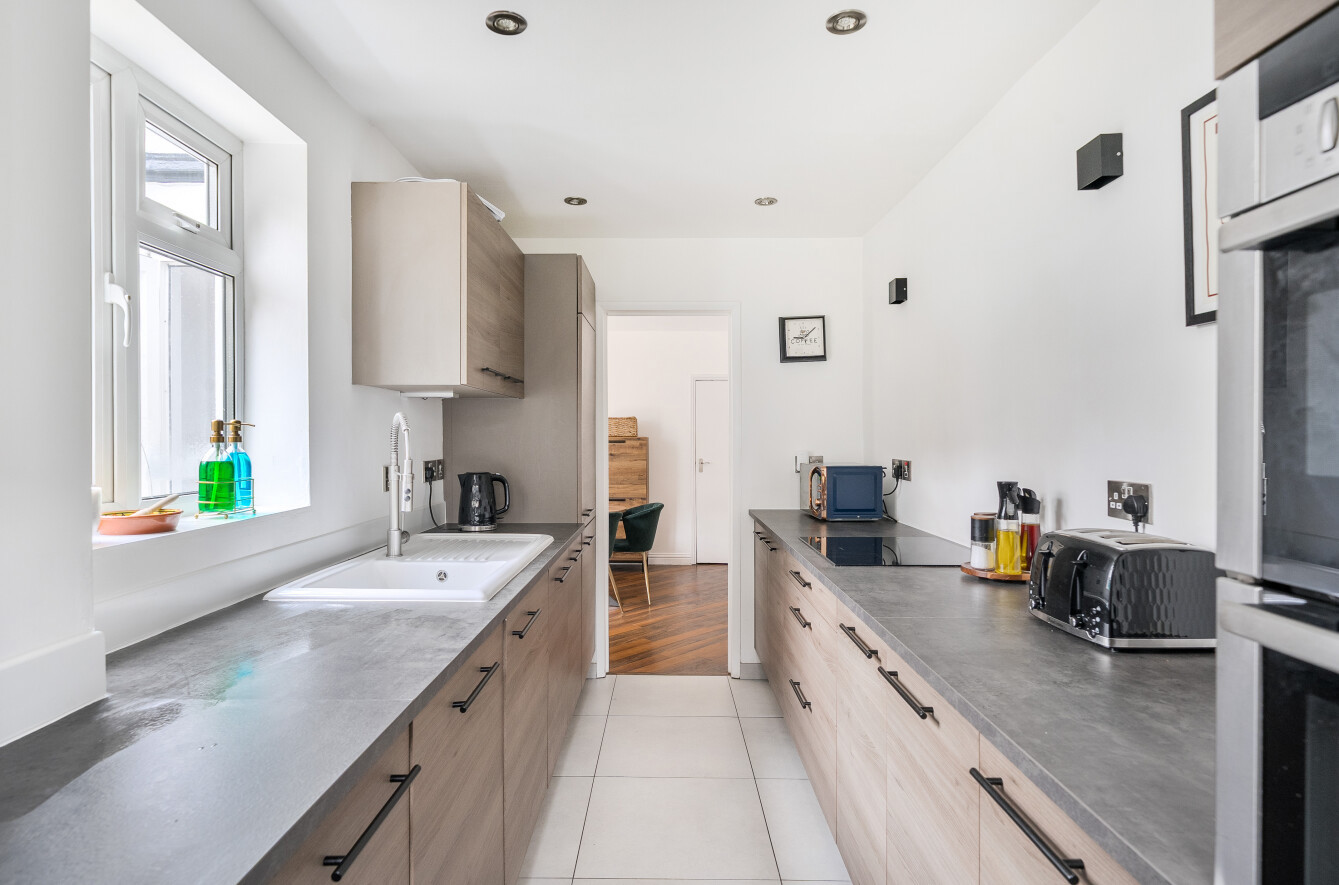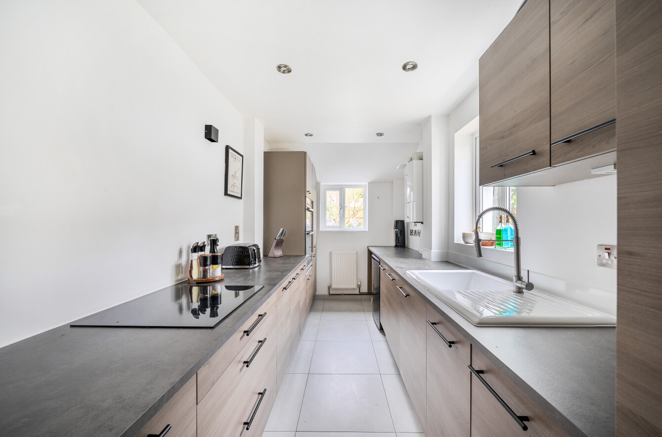 The contemporary kitchen is comprehensively fitted with a range of base and eye-level units and matching drawers, integrated appliances and updated worktops and sink installed in 2021, creating a practical and attractive cooking space.