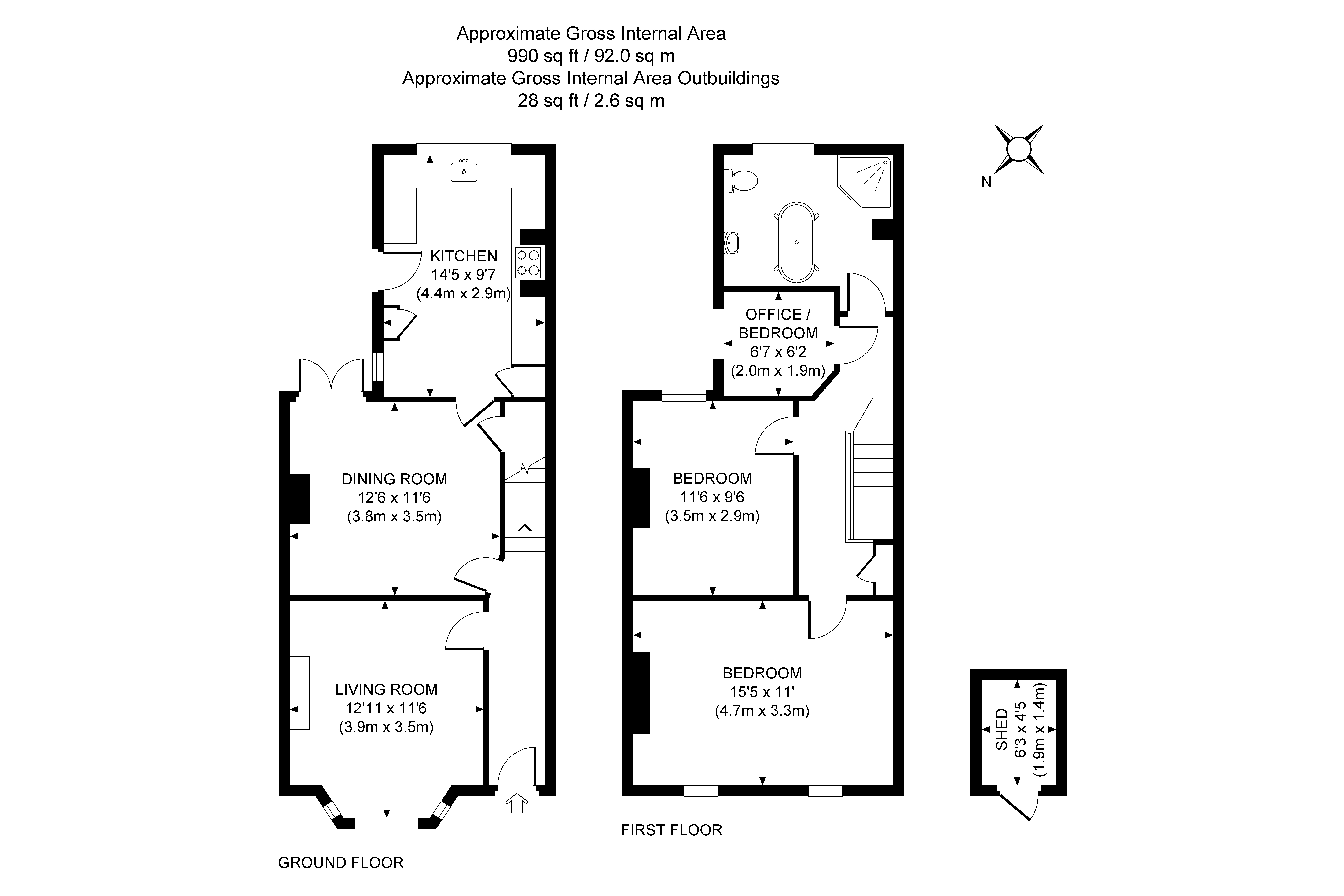 Upstairs, are the three bedrooms. The main bedroom is front aspect with a fireplace, twin sash windows and exposed floor timbers. The bathroom is spacious, with a roll top bath with mixer tap, separate shower cubicle, low level W/C and period style wash hand basin. The house is double glazed throughout, heated with a gas fired system to radiators and also features dipped panelled doors with period style rim locks.