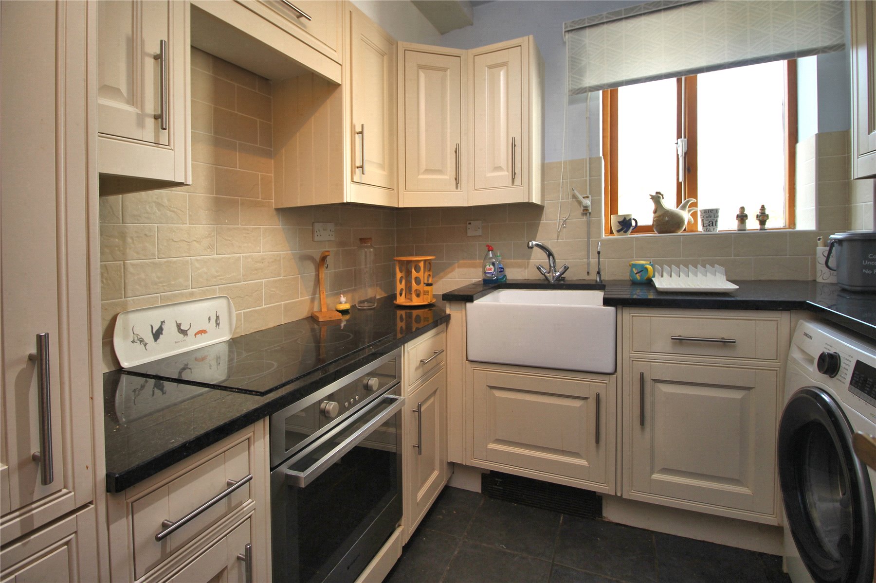 There is access to the balcony from both the main bedroom and the living room, whilst the kitchen is stylish and features granite worktops, butlers sink and integrated appliances.