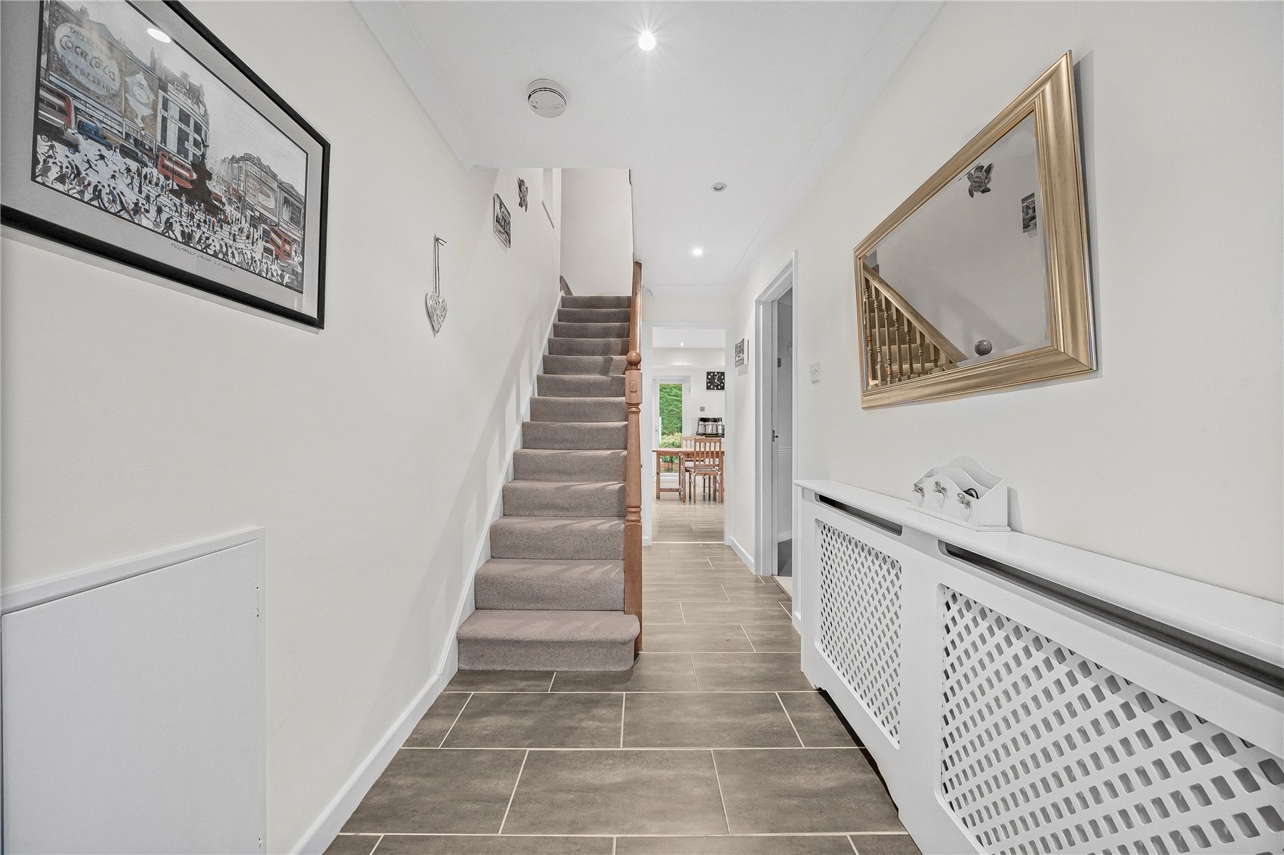 The downstairs arrangement is particularly spacious with an extended hallway flowing seamlessly into both the principal reception room as well as the kitchen/dining room. Overlooking the rear garden, and with doors leading to the full width patio, the kitchen/dining room provides the perfect space for socialising and entertaining. Adjoining is a more formal dining room which in turn leads to a utility area and a downstairs cloakroom.