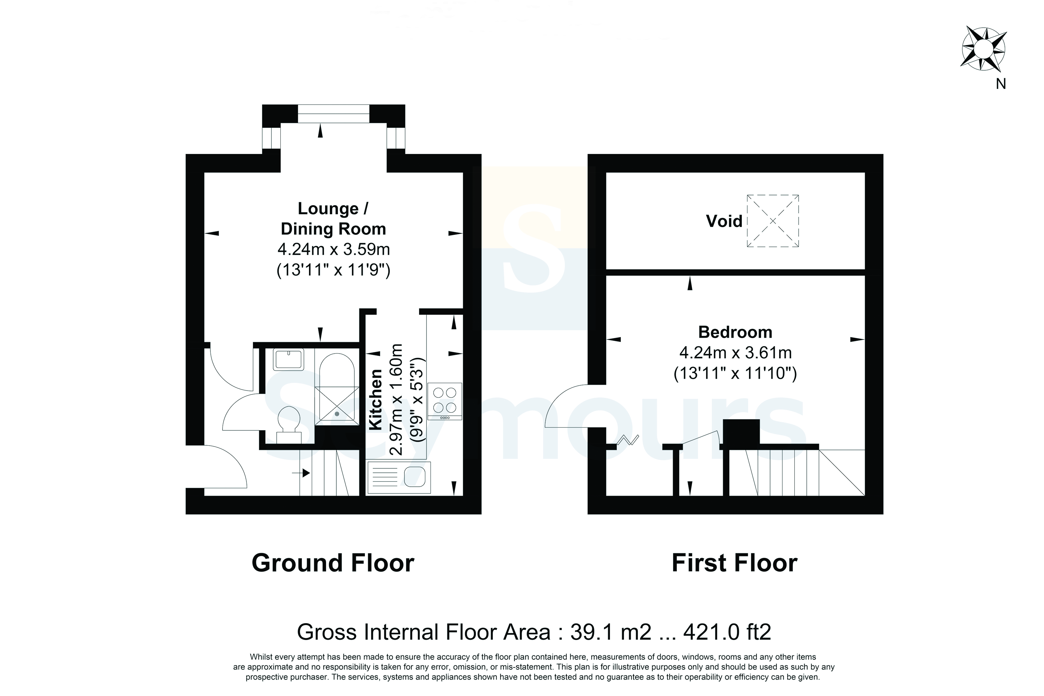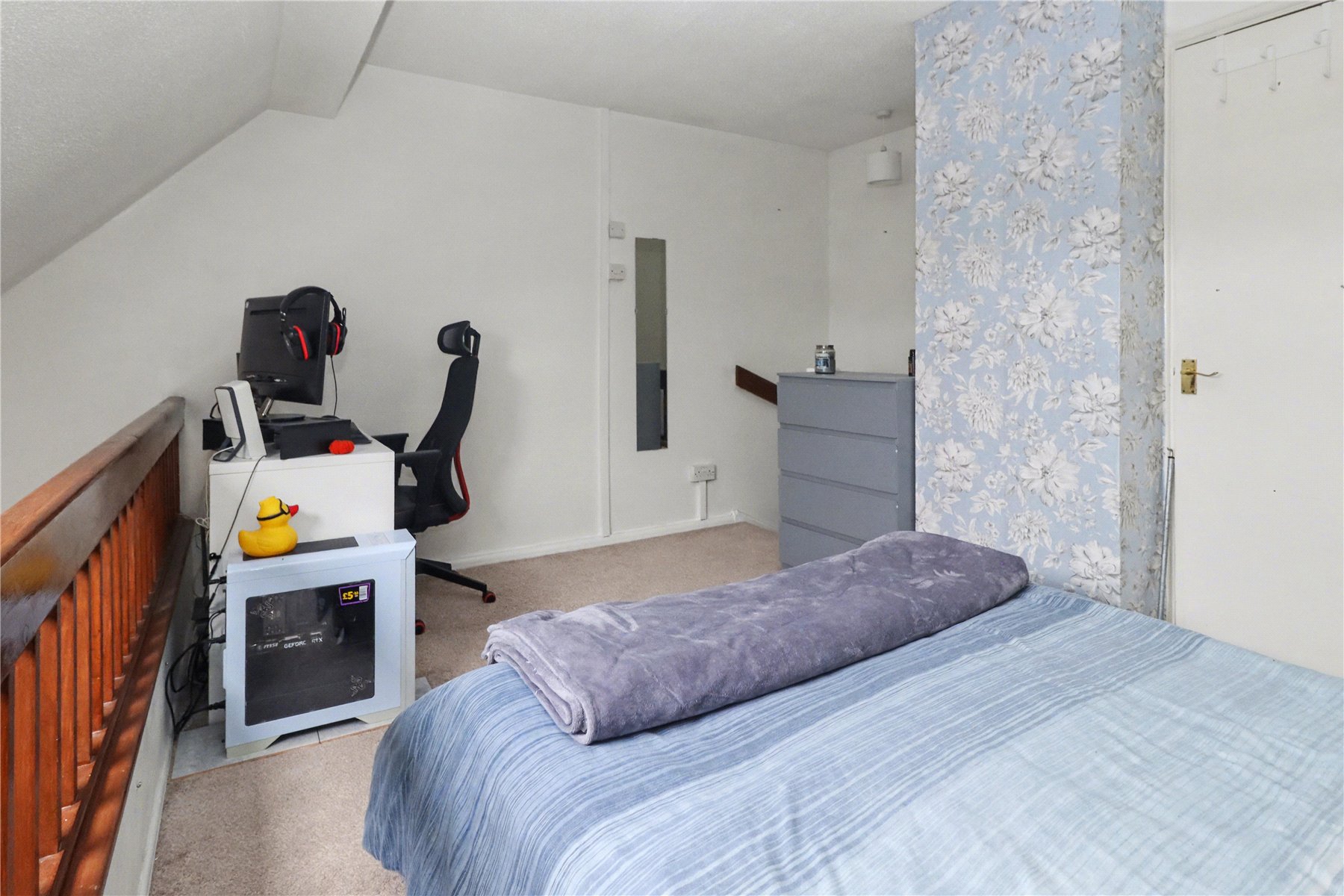 Upstairs, a galleried double bedroom overlooks the living space below and benefits from built-in storage cupboards and a Velux window, allowing plenty of natural light.