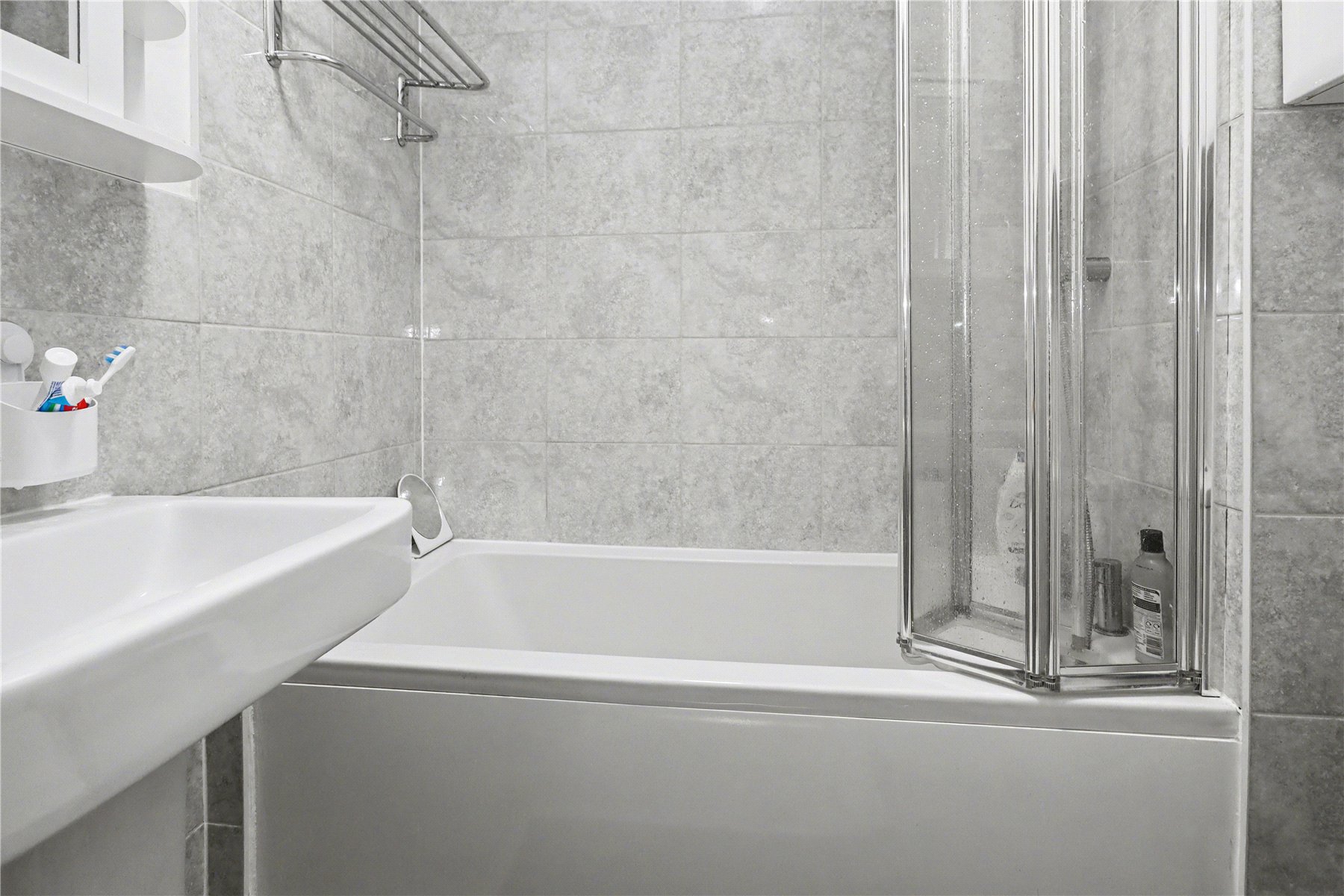 The modernised bathroom is finished with floor-to-ceiling tiling and a contemporary shower over the bath.