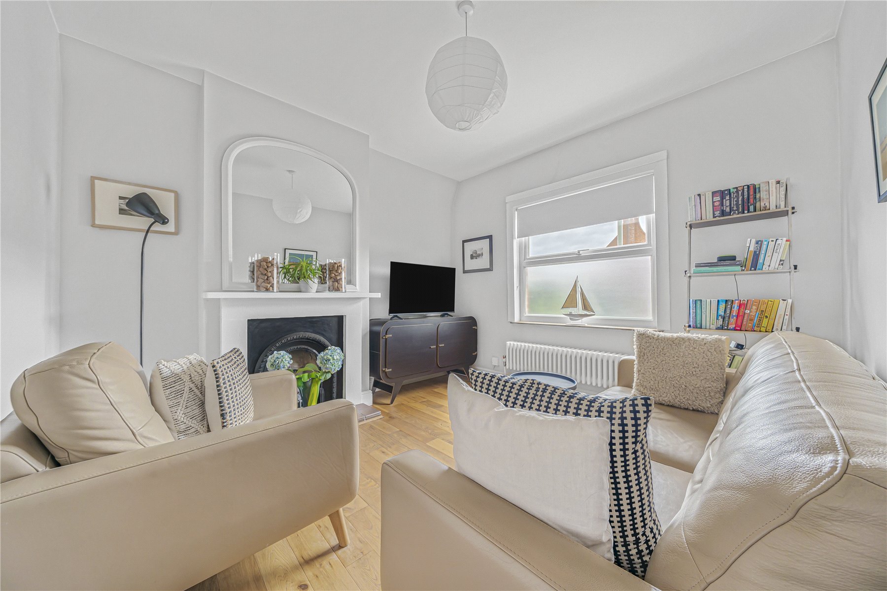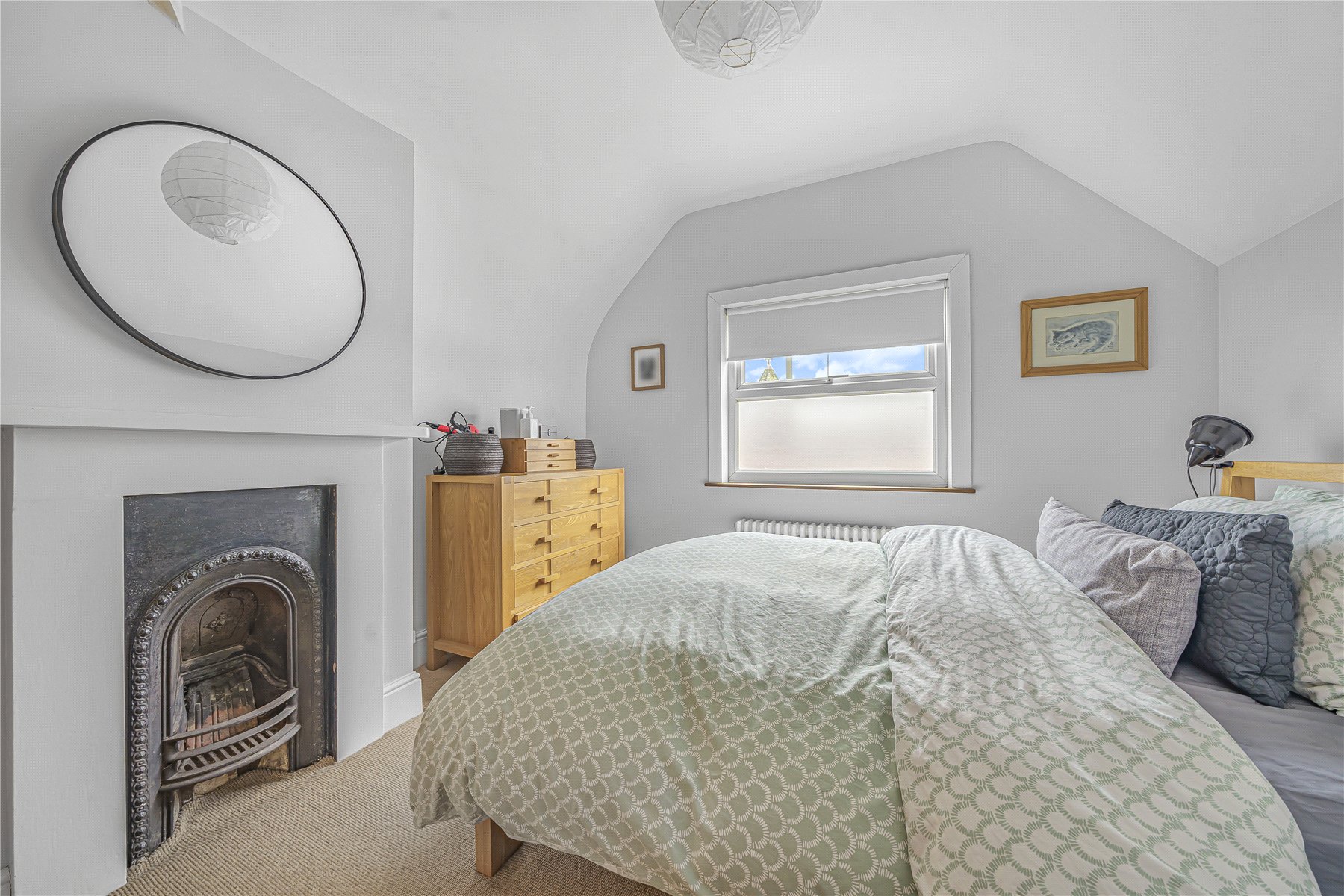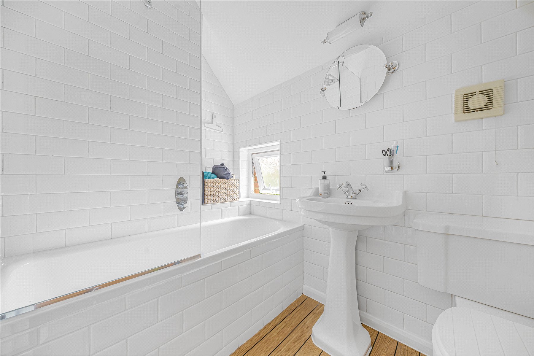Accommodation comprises two well-proportioned double bedrooms, each featuring an original cast iron fireplace. The bedrooms share a stylish family bathroom fitted with a traditional white suite including a wash hand basin, WC, and bath. White metro tiles complete the space with a timeless, elegant finish.