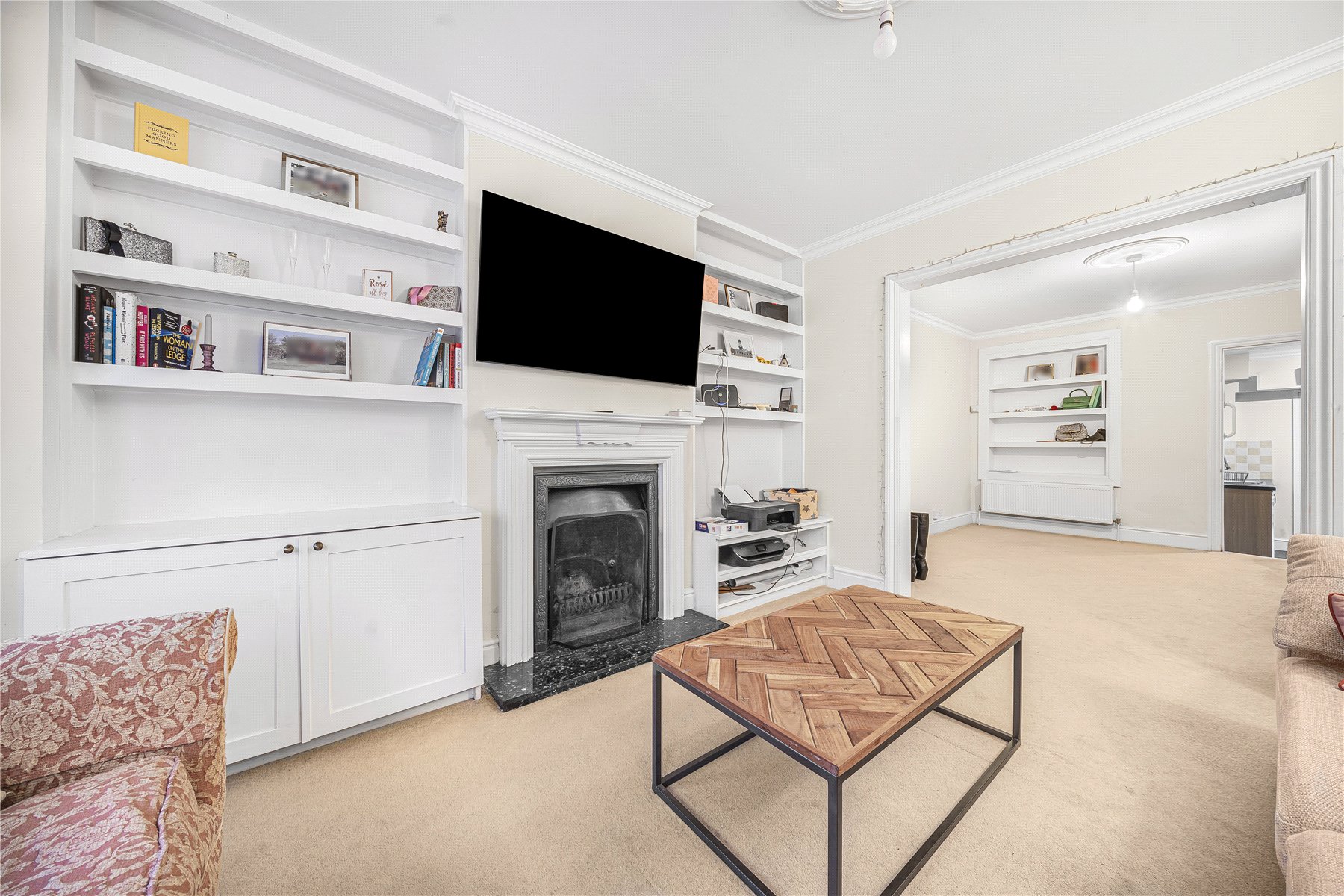 On the ground floor, the front aspect lounge enjoys a bay window and a stunning feature fireplace, complemented by bespoke shelving and cabinetry in the recesses. This flows seamlessly into a charming dining room, also benefitting from custom shelving. To the rear, a well-equipped kitchen features an attractive range of shaker-style base and eye-level units, an integrated oven with gas hob and space for additional appliances. An adjoining utility room offers further storage and access to the garden.