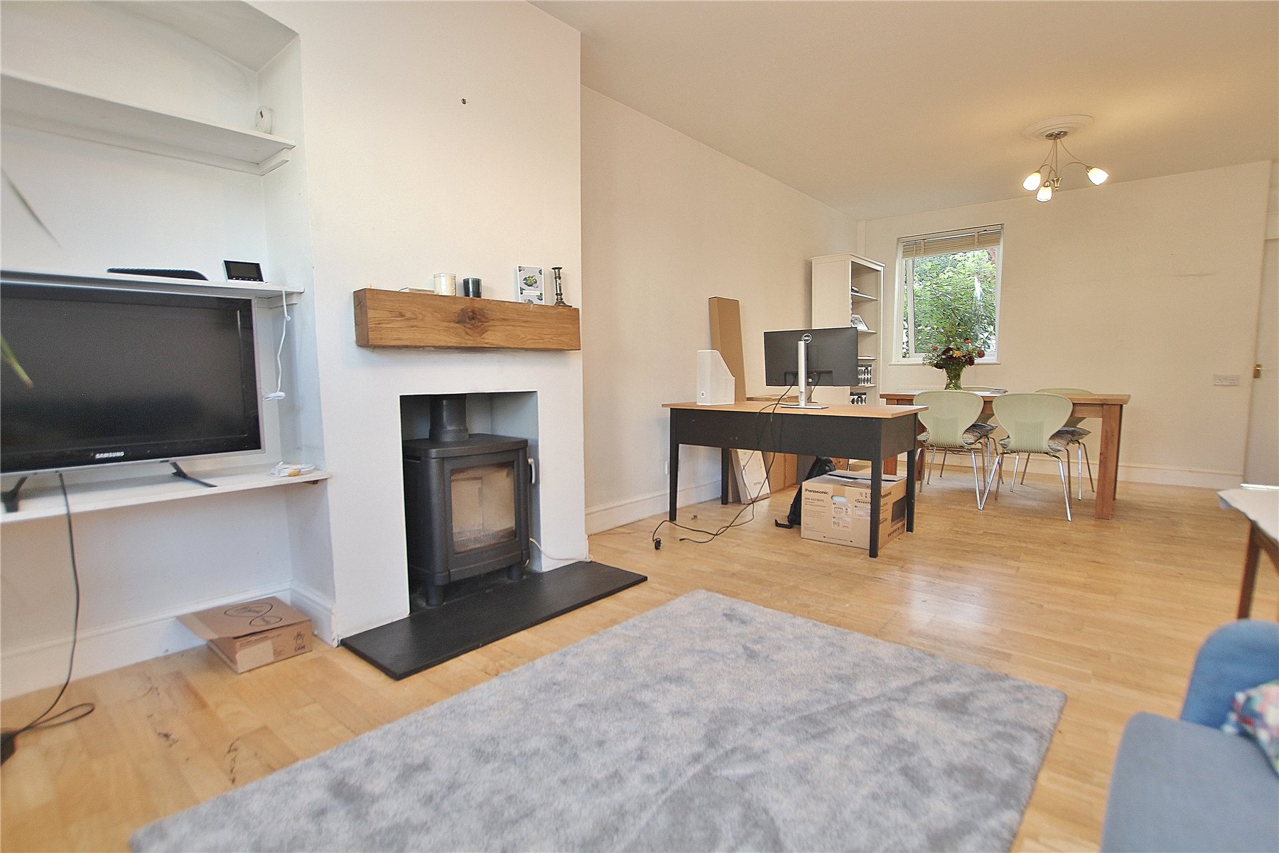 Downstairs there are two reception rooms comprising dining room and front aspect living room with bay window and feature fireplace with log burner.