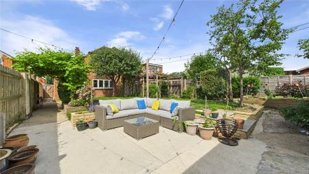Externally, the rear garden has been beautifully landscaped to provide a private and functional outdoor space, featuring a sunken seating area that is perfect for entertaining. There is also a generous lawned area for children to enjoy. To the rear of the garden, a substantial outbuilding offers a variety of potential uses whether as a home office, gym, or studio. To the front, the property offers off-street parking for multiple vehicles.