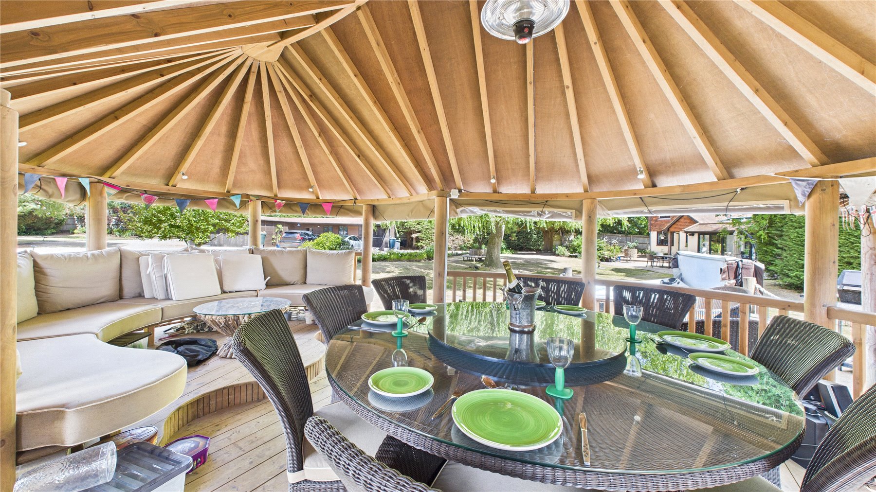 The grounds, extending to approximately one acre, have been thoughtfully landscaped to offer year-round enjoyment. Highlights include a covered garden seating area ideal for al fresco dining, an outdoor BBQ space, and dedicated area with space for a hot tub all framed by mature trees offering total privacy.