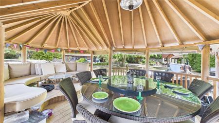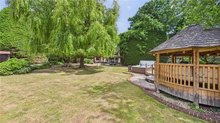 The grounds, extending to approximately one acre, have been thoughtfully landscaped to offer year-round enjoyment. Highlights include a covered garden seating area ideal for al fresco dining, an outdoor BBQ space, and dedicated area with space for a hot tub — all framed by mature trees offering total privacy.