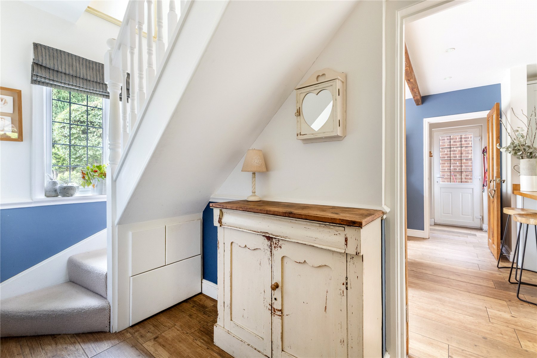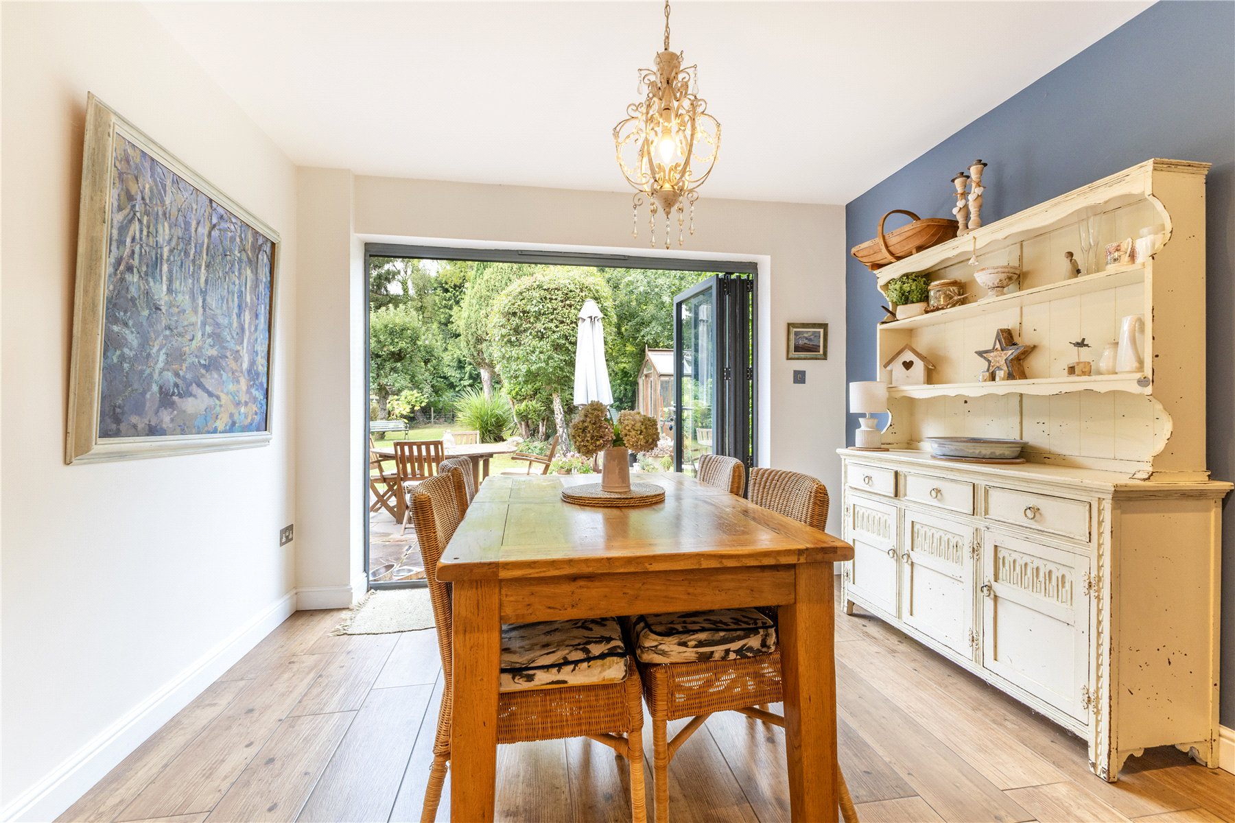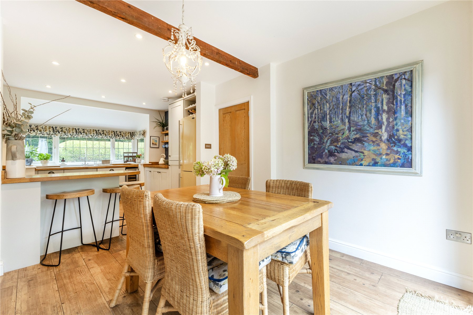 The beating heart of the home is a stunning open plan kitchen with bi-folding doors giving access to the garden. The cottage style kitchen has been fitted with a range of base and eye level shaker style units that are perfectly complimented by solid wood worktops. A breakfast bar is another useful addition providing seating for three. Adjoining is a utility and a downstairs shower room, completing the accommodation on offer.