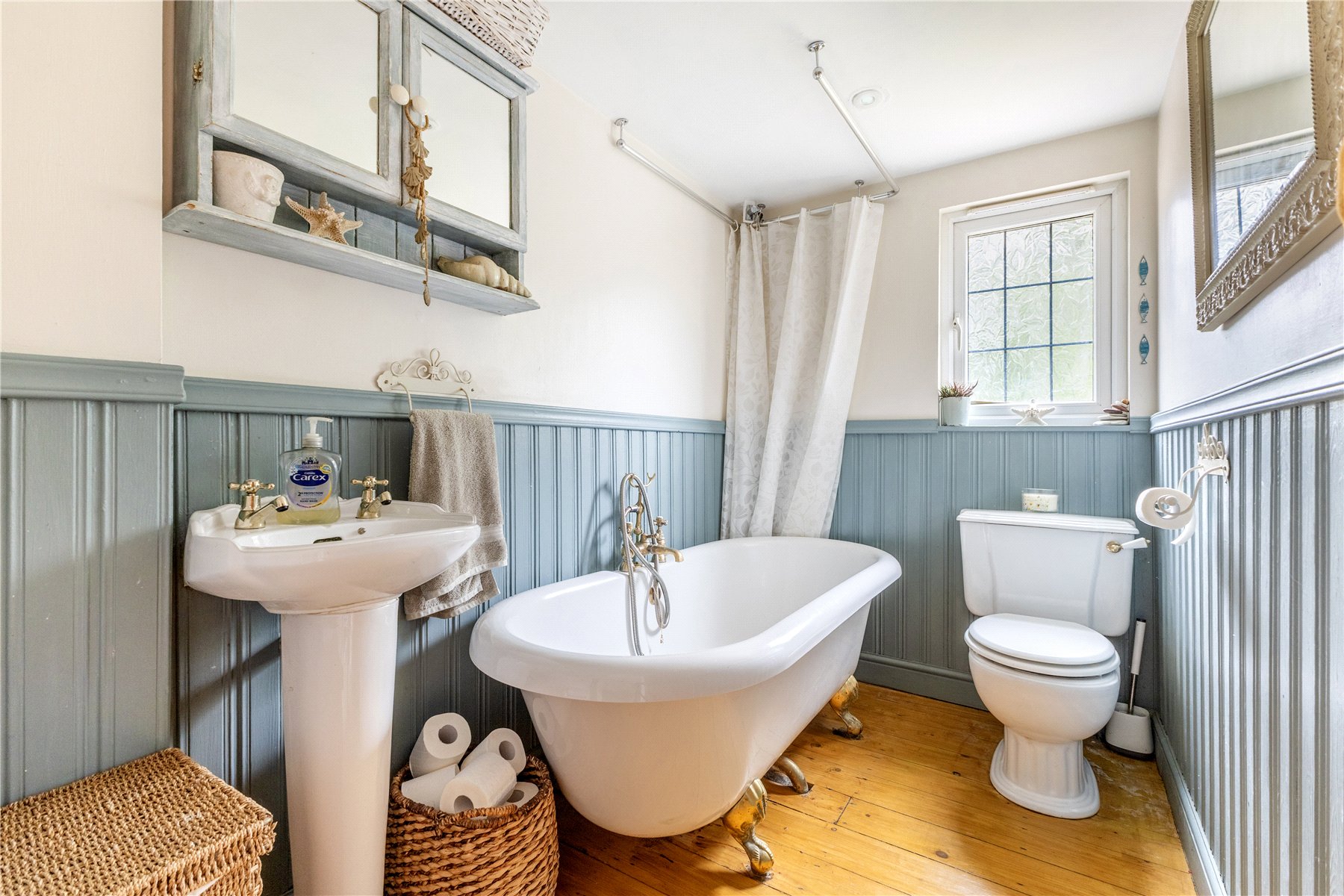 First floor accommodation includes three bedrooms, the master enjoying the use of a range of built in wardrobes. These share the use of a family bathroom fitted with a traditional suite including w/c, wash hand basin and roll top bathroom. Wood panelling provides another splash of character.