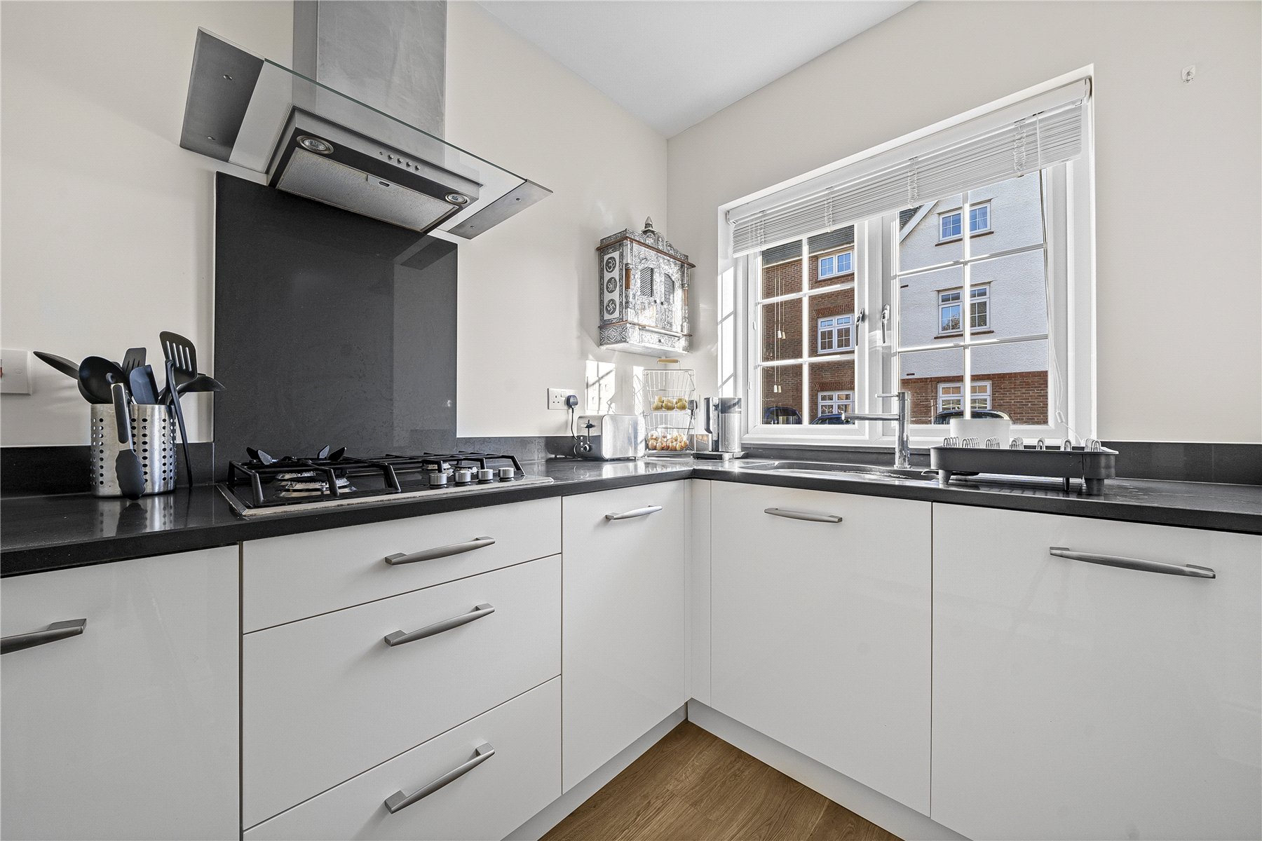 The ground floor features a stylish front aspect kitchen fitted with high quality units and a range of integrated appliances, including a dishwasher, fridge freezer, double oven and gas hob. To the rear, a bright and generously sized lounge/dining room opens onto the garden through double doors, creating a seamless indooroutdoor flow perfect for relaxing or entertaining. Amtico flooring runs throughout and a modern downstairs cloakroom completes the ground floor.
