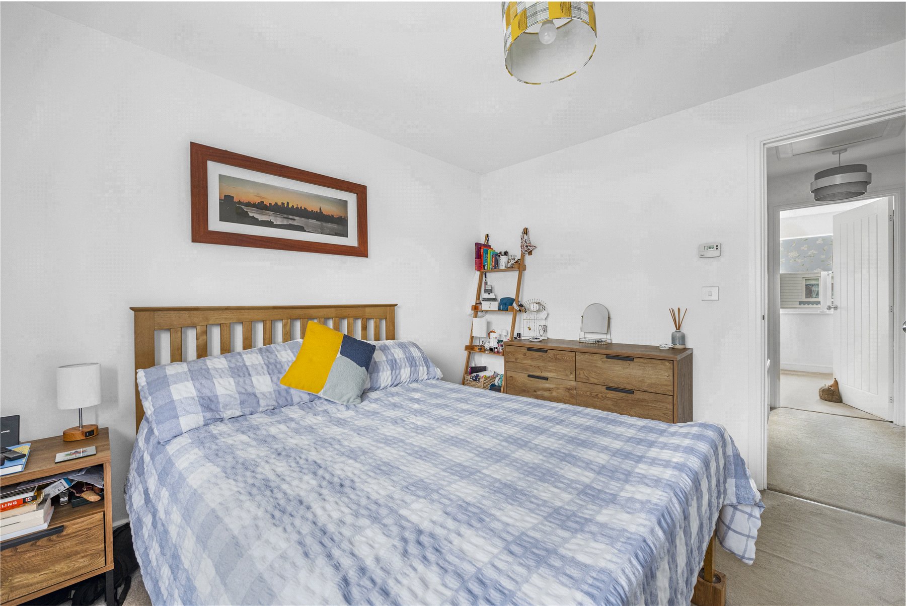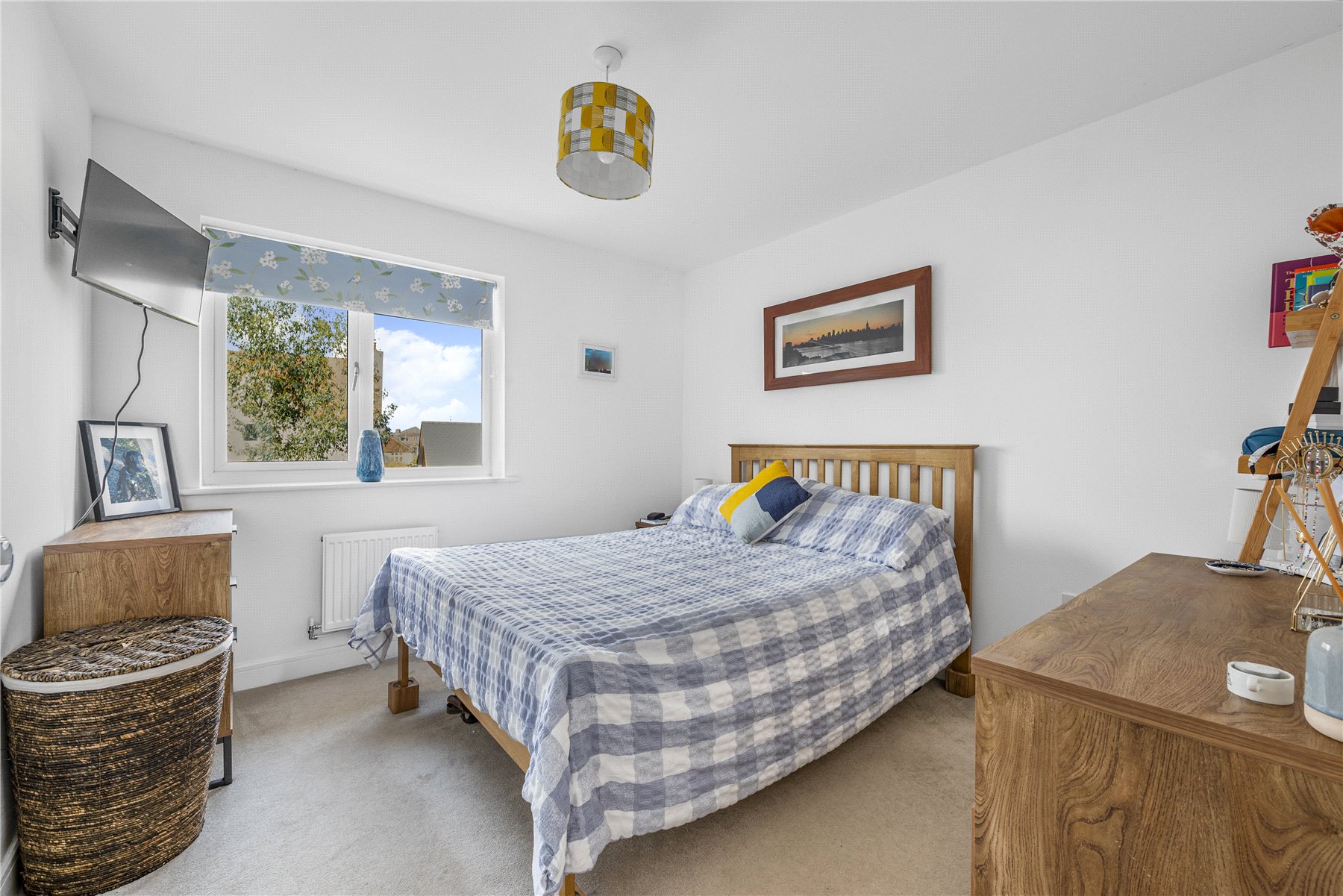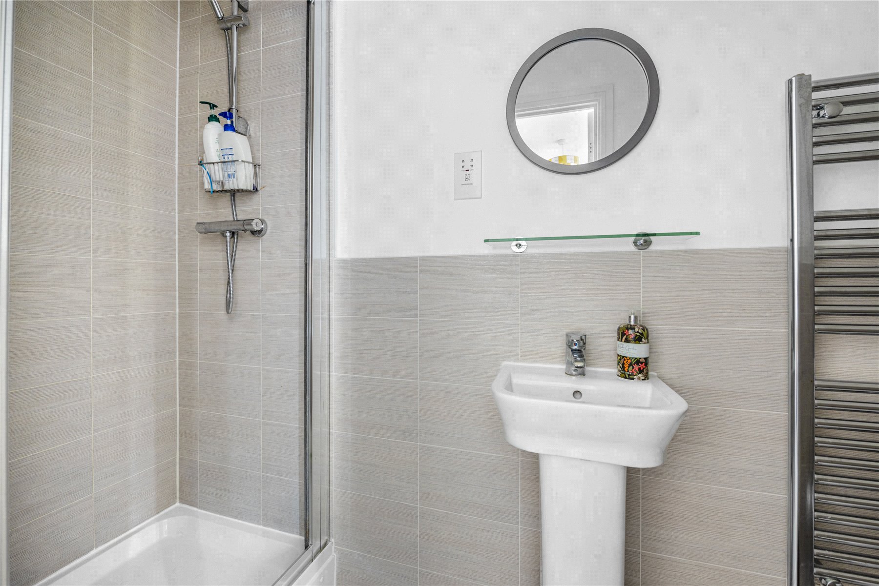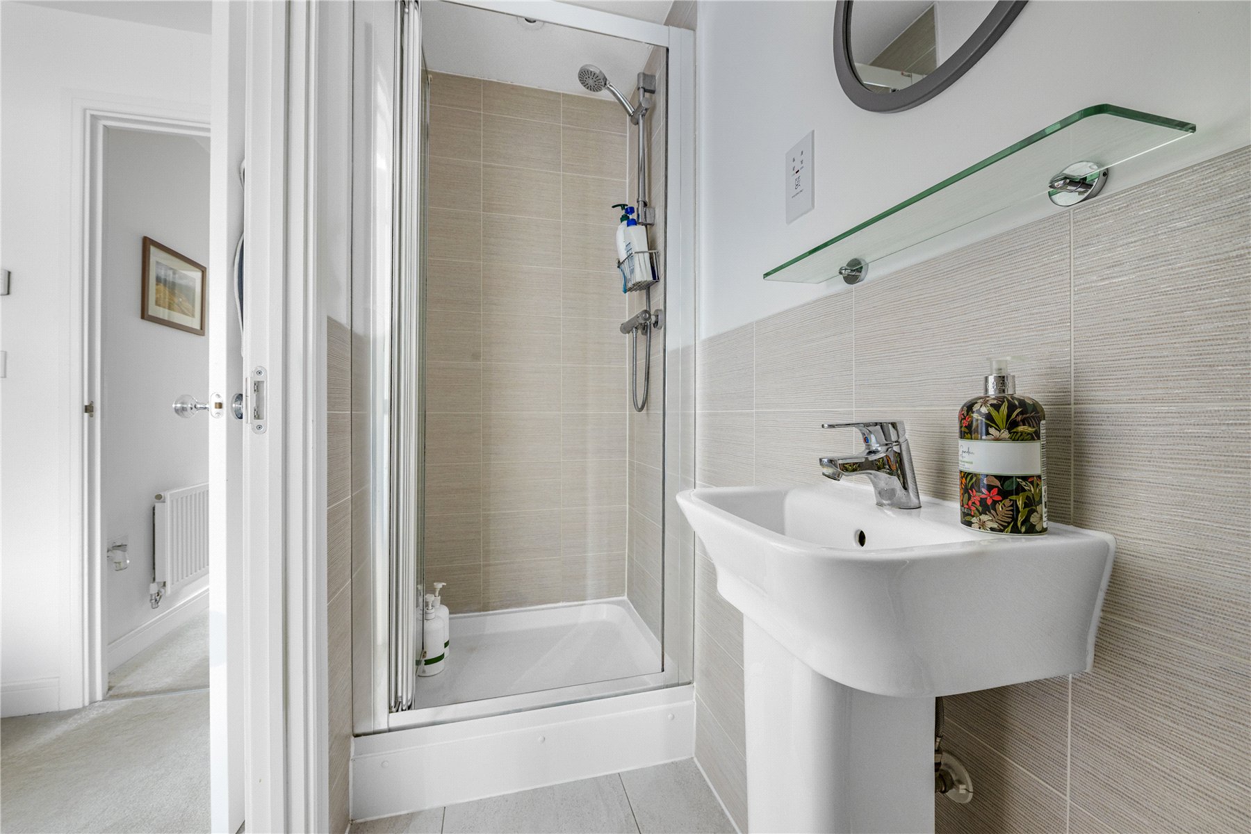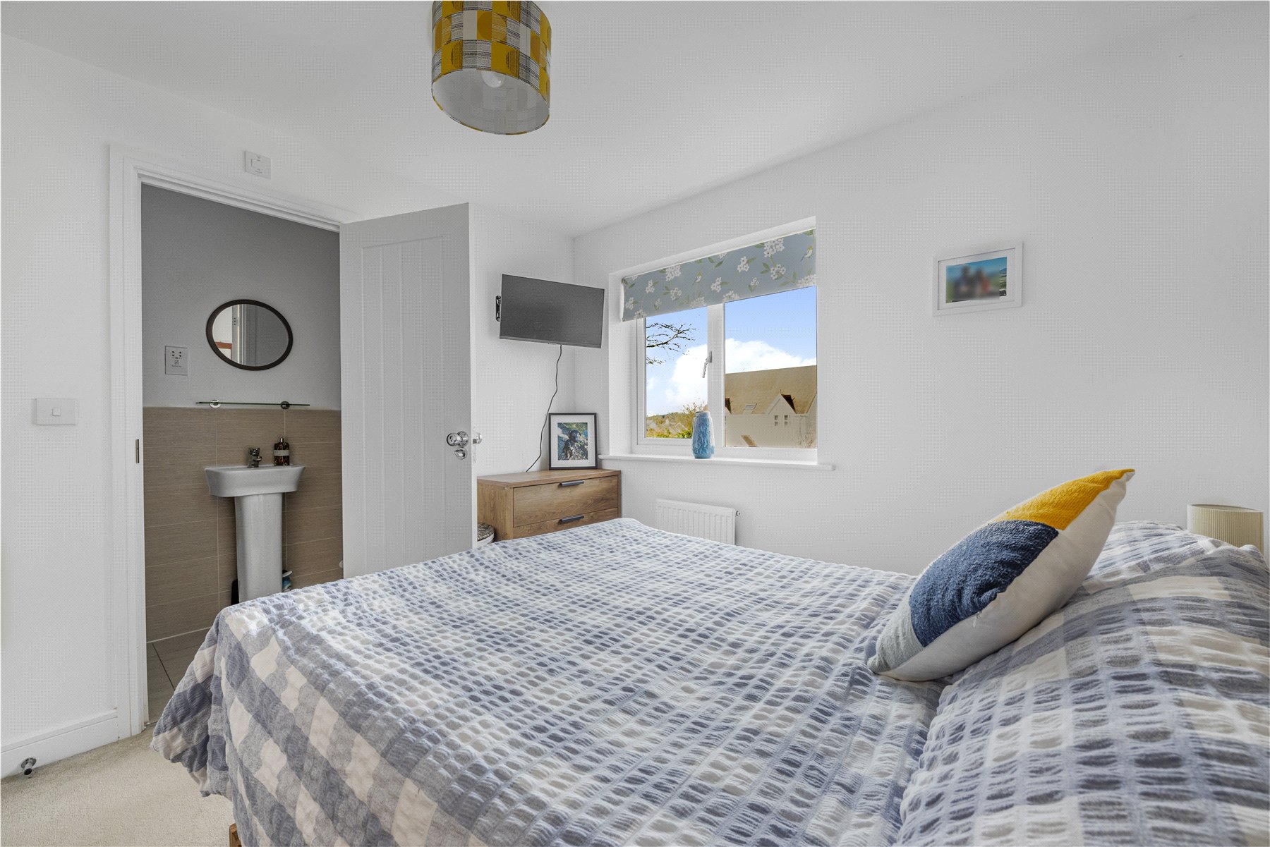 Upstairs, there are two generously sized double bedrooms, with the principal bedroom benefiting from its own ensuite shower room. The family bathroom is fitted with a modern suite comprising a wash hand basin, WC, and a bath with wall-mounted shower, complemented by floor-to-ceiling tiling.