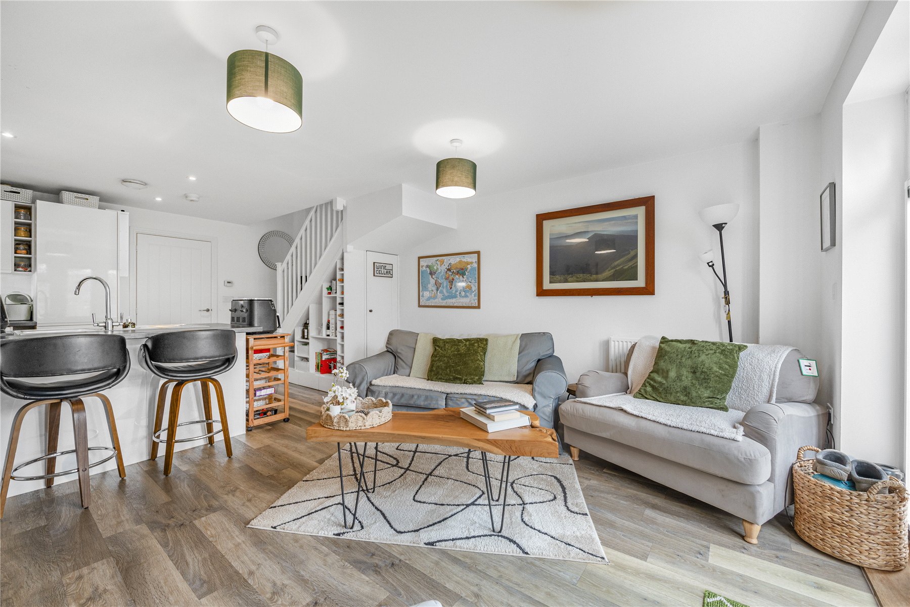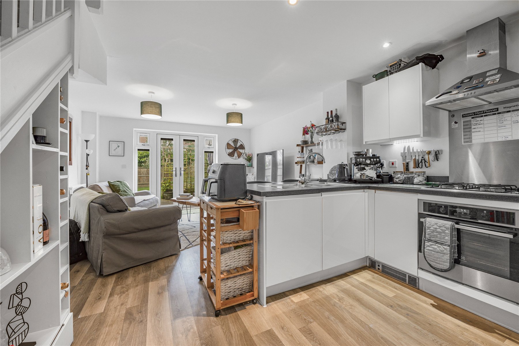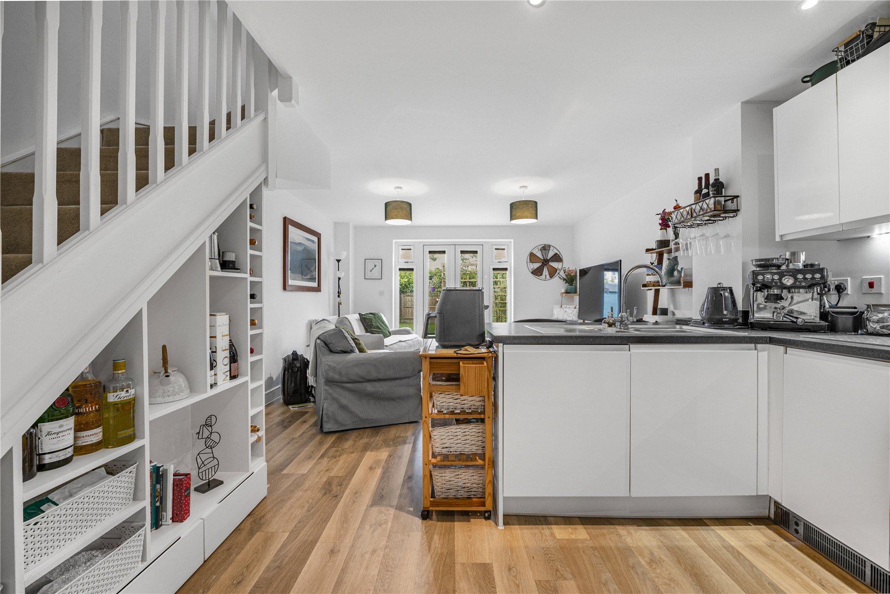 The main living area is open plan, combining the kitchen, living and dining spaces to create a bright and sociable environment. The kitchen is fitted with sleek high gloss base and wall units and includes integrated appliances such as an oven with gas hob, fridge freezer and dishwasher. A breakfast bar provides comfortable seating for two, making it an ideal spot for casual dining. The understairs area has been thoughtfully utilised with bespoke built in shelving and storage units, offering both practical and stylish additional storage. The living area benefits from double doors that open directly onto the rear garden, allowing plenty of natural light and easy access to the outdoor space.